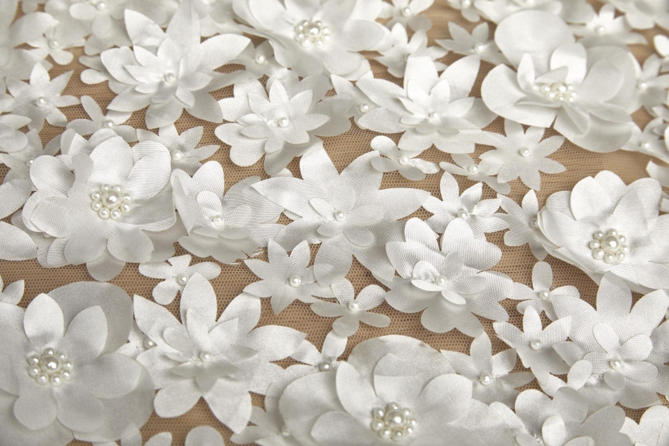 So pretty, this is a sheer synthetic tulle in ivory, completely covered in laser cut flowers in duck egg blue habotai with a pearl centre to each flower. The flowers are of assorted shapes and sizes.