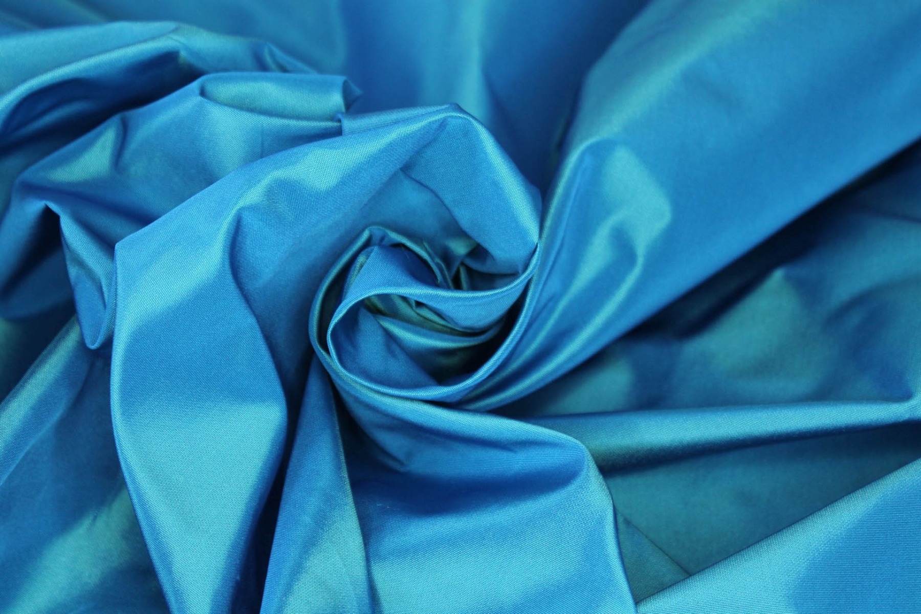 Our French made 100% acetate taffetas are crisp in structure, woven tightly to give the classic smooth taffeta finish. This is a firm fabric, in bright blue shot with aqua, resulting in an iridescent blue.