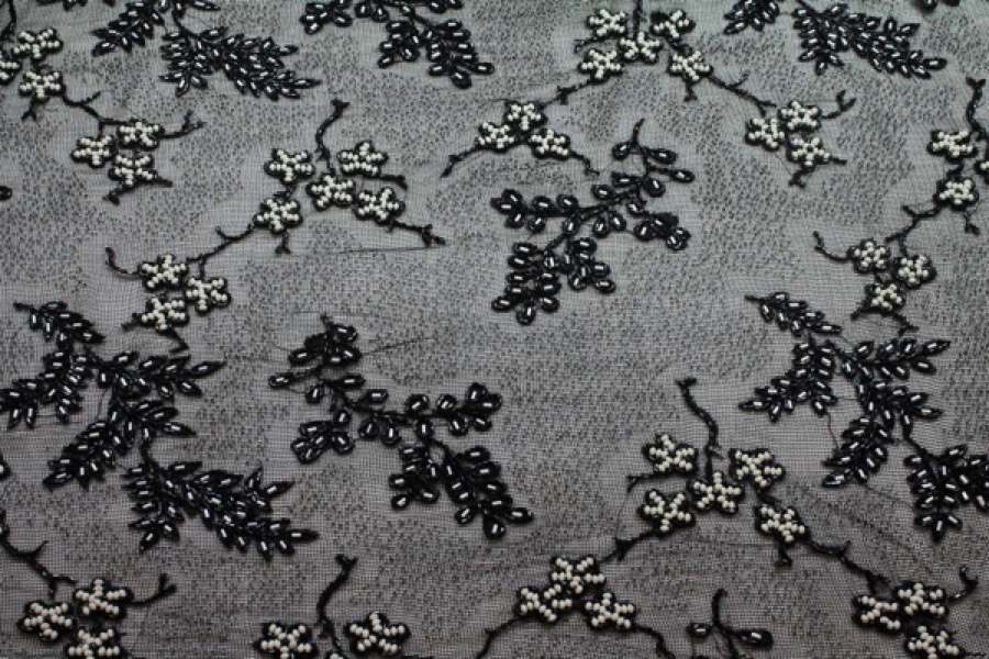 Black floral cotton lace base with black and white bugle beads and ivory textured beads.