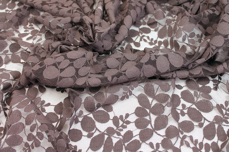 A more affordable variation of lace, this features a leafy patten and a double scalloped edge. Brown. 68% cotton, 32% nylon.