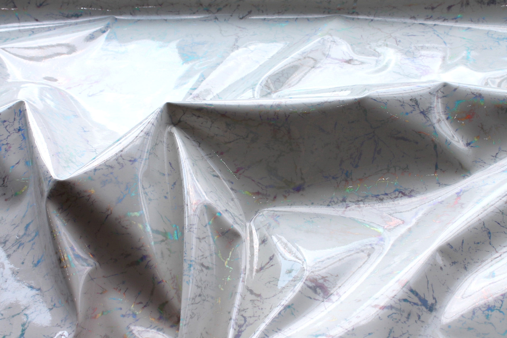 This is a medium weight vinyl / leatherette in off white with a high gloss holographic silver speckled pattern, like marble.