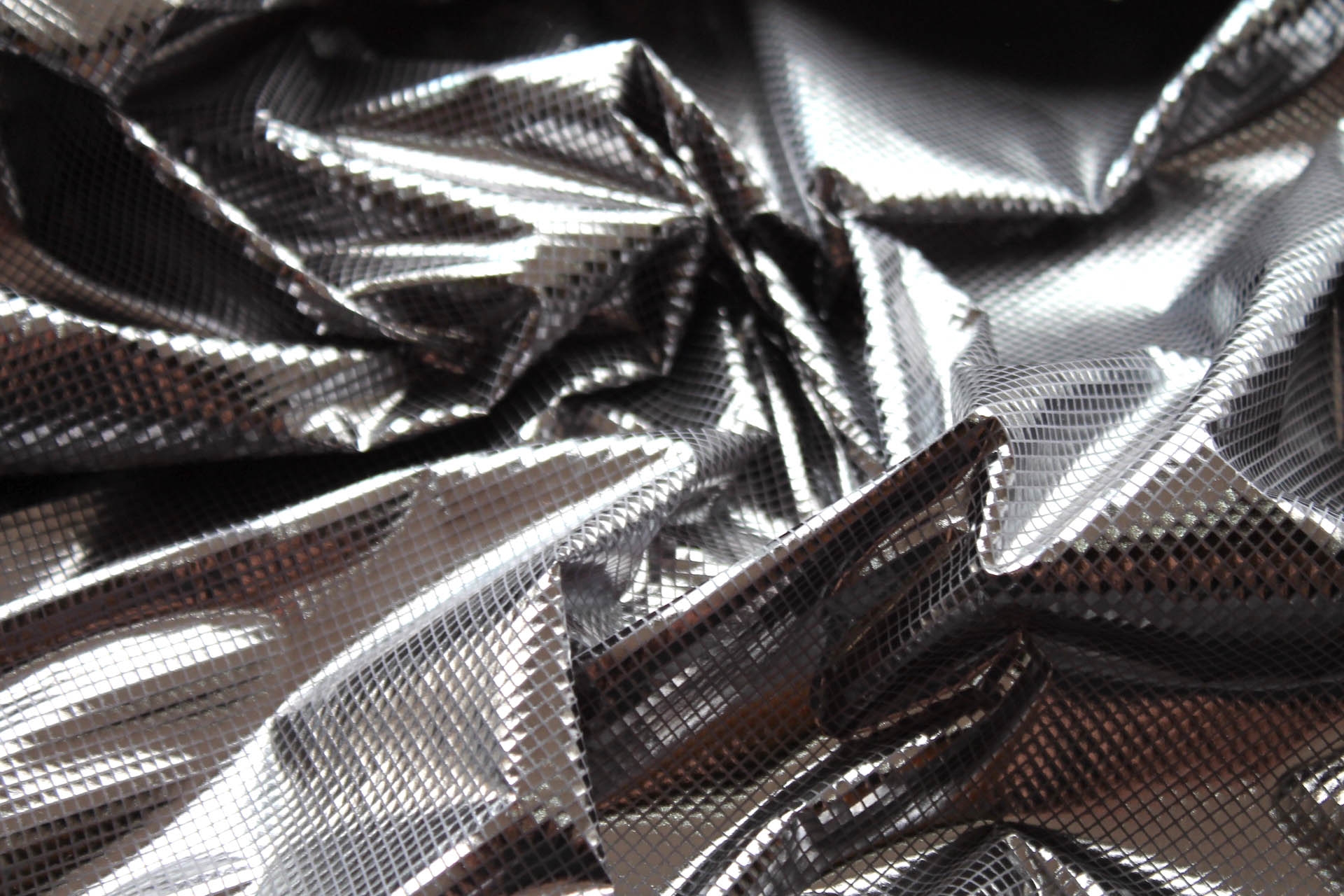This is a lightweight polyamide fabric that has been foiled in a blueish silver gunmetal colour, with a small square pattern to it. Super fine with great flow.