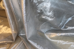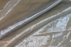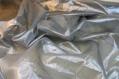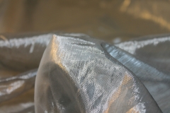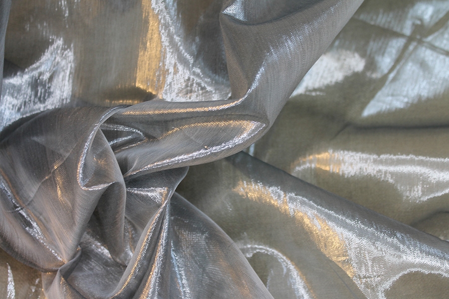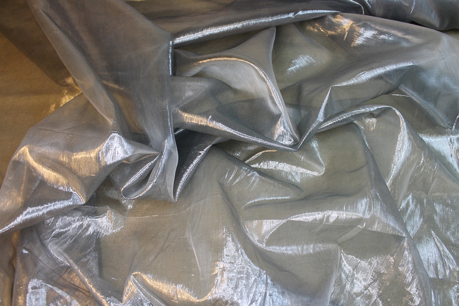 A sheer, structured lurex organza in a grey colour. This is a shimmery organza with clear lurex weft and grey polyester warp yarns giving a plastic look. Wide width at 140cm.