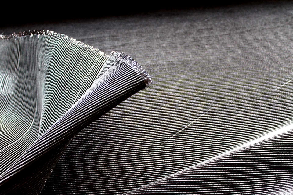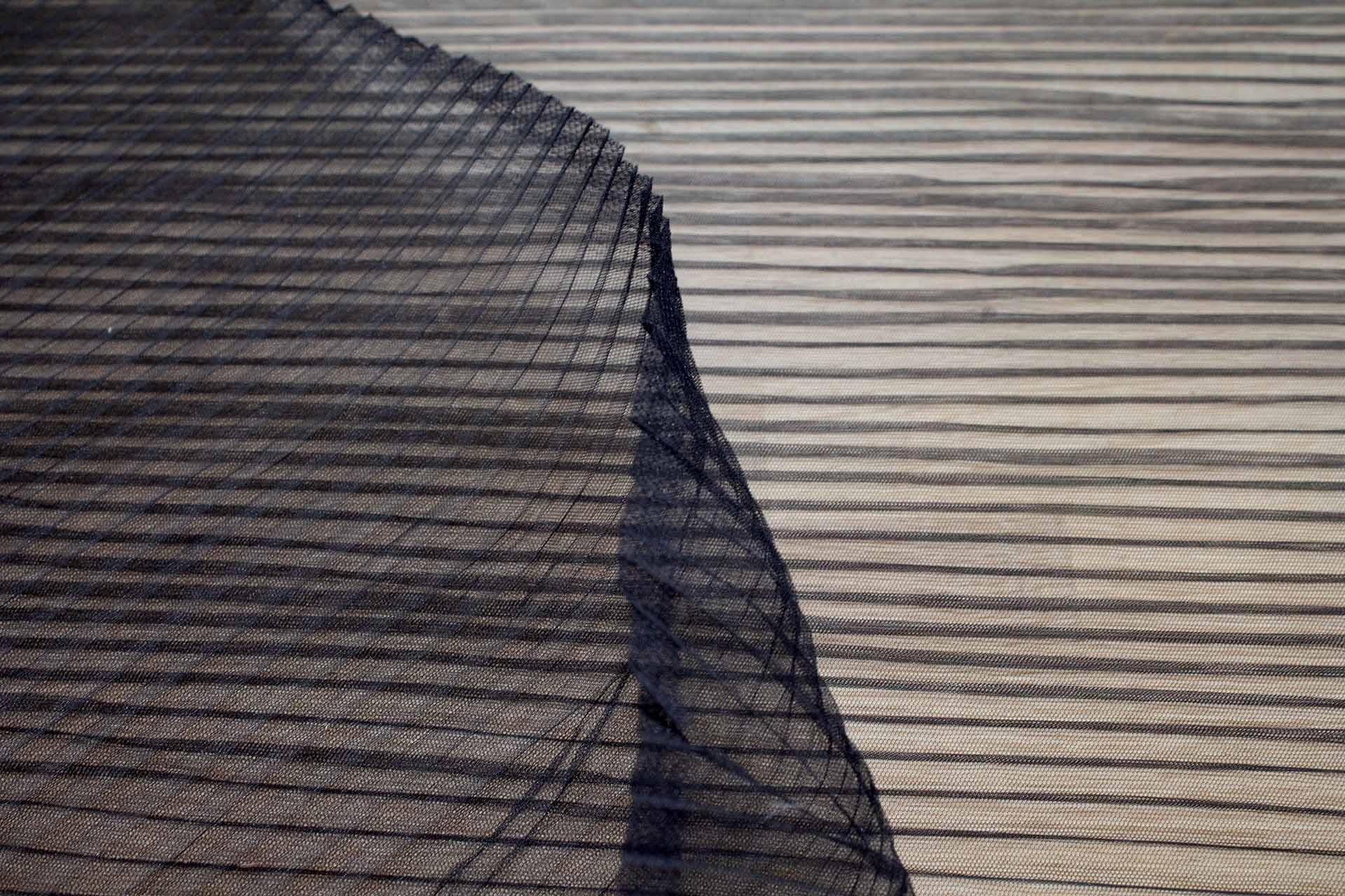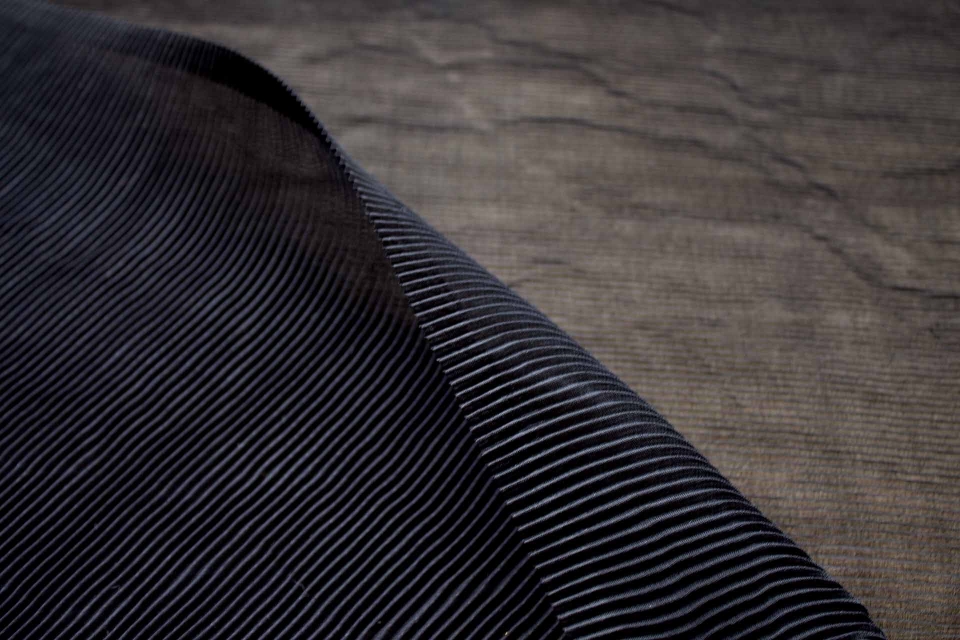 A fine black nylon tulle fabric that has been finely pleated in 4-5mm crystal pleats from selvedge to selvedge. Crisp to the touch.