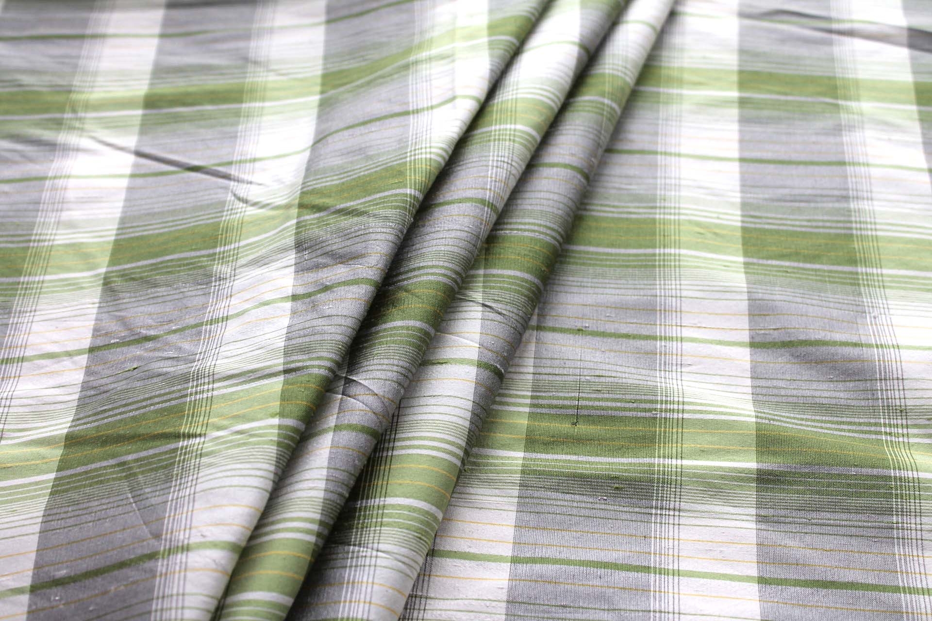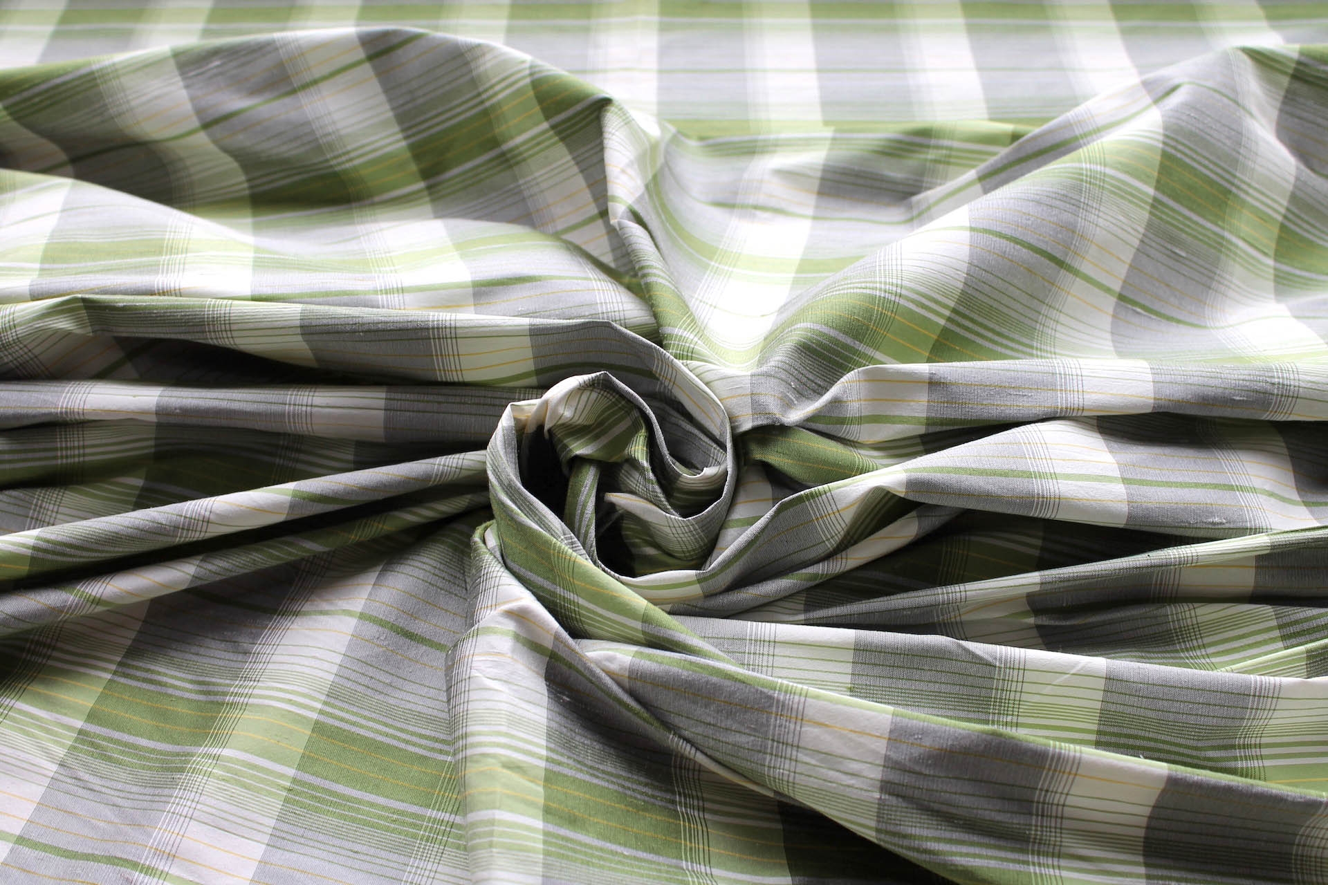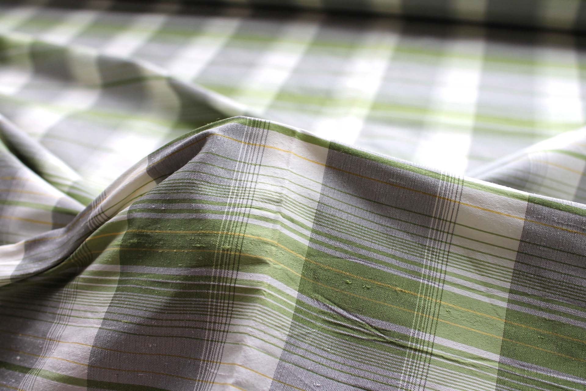 This is a woven tartan dupion in 100% silk, in a classic check combination of ivory, green, grey and a touch of yellow.