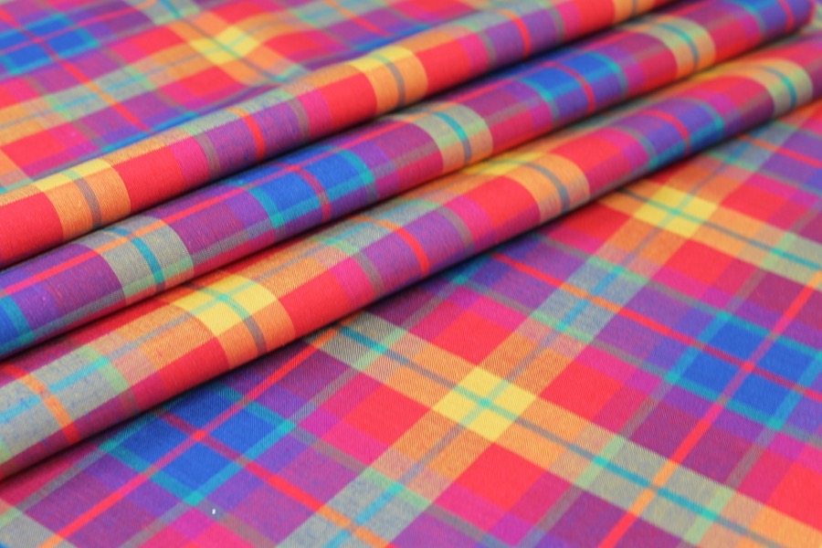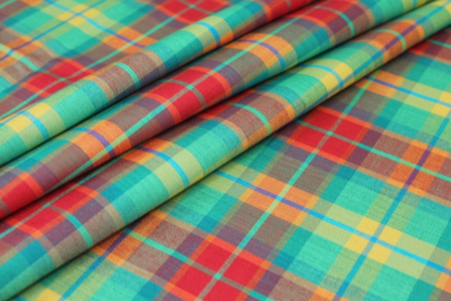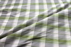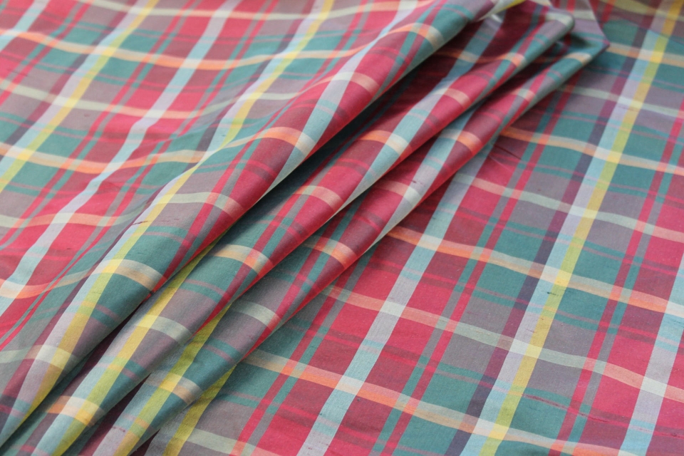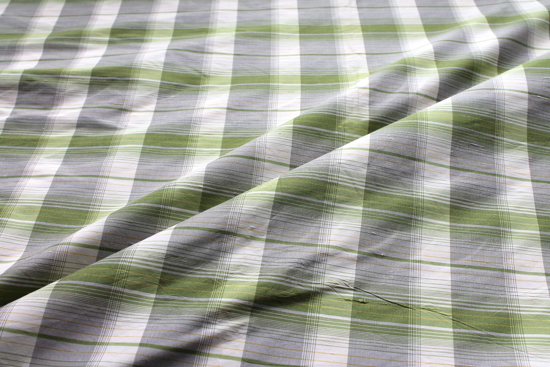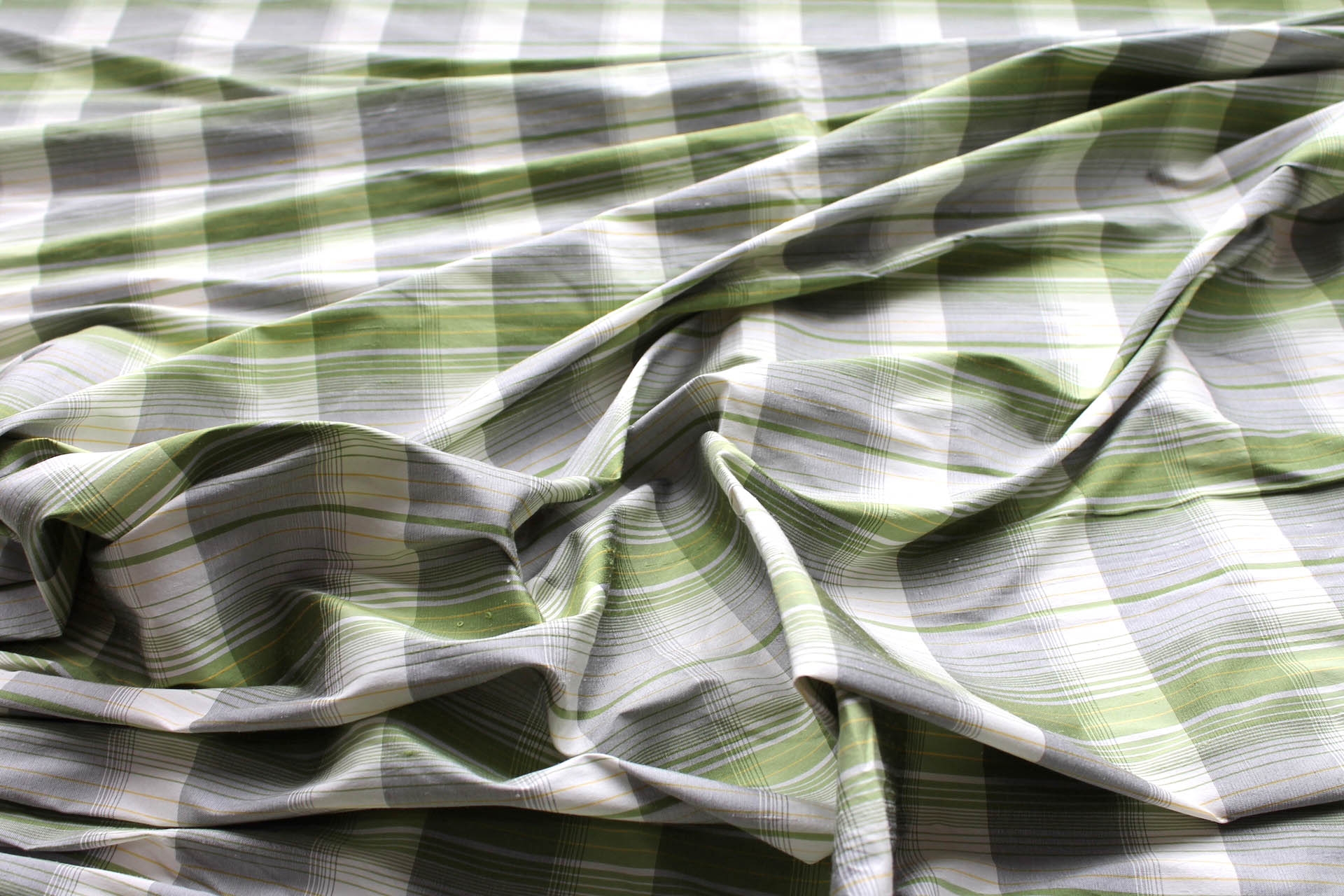 This is a woven tartan dupion in 100% silk, in a classic check combination of ivory, green, grey and a touch of yellow.