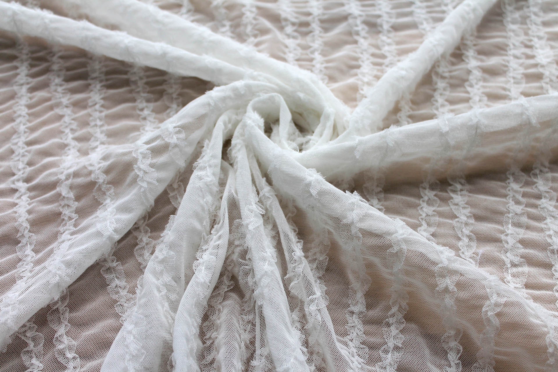 This very soft ivory stretch polyester tulle has lines of little ruffles stitched almost like squiggly stripes running down the length of the fabric. This tulle has elastane in it, so it has some stretch.