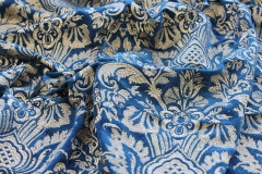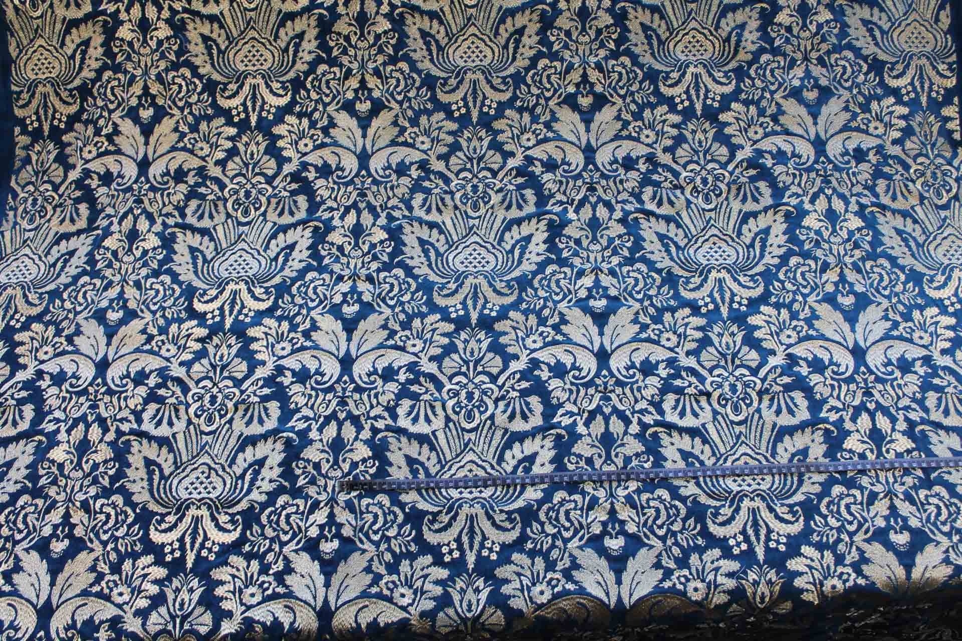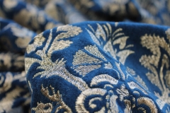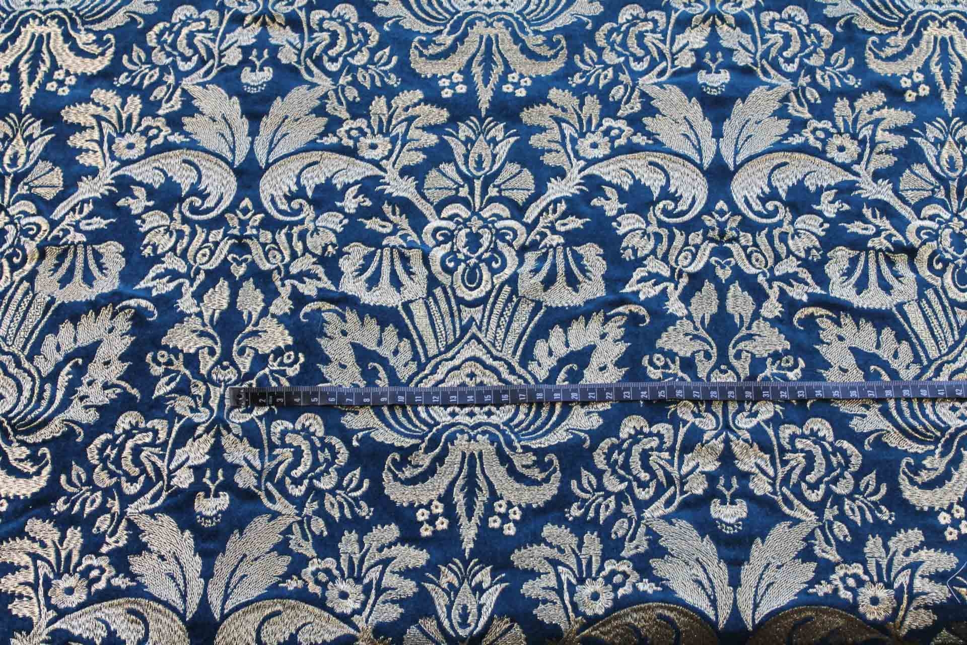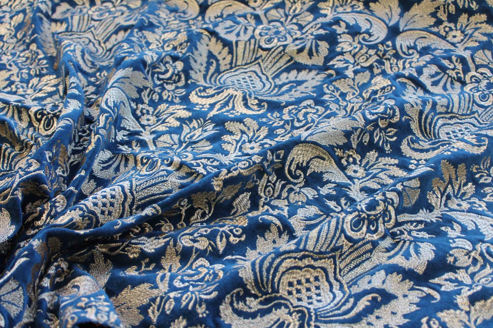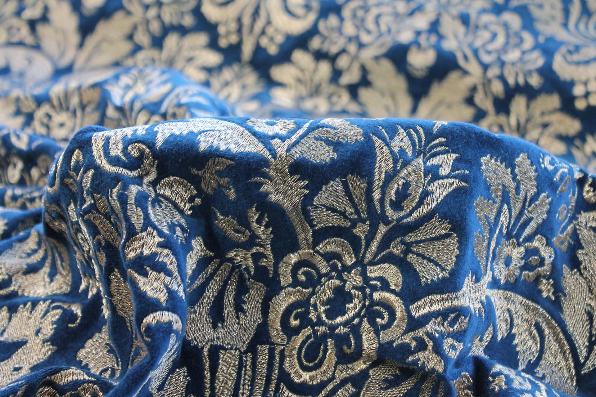 A beautiful cotton velvet base in a deep blueish teal with a detailed jacquard style embroidery in metallic gold.