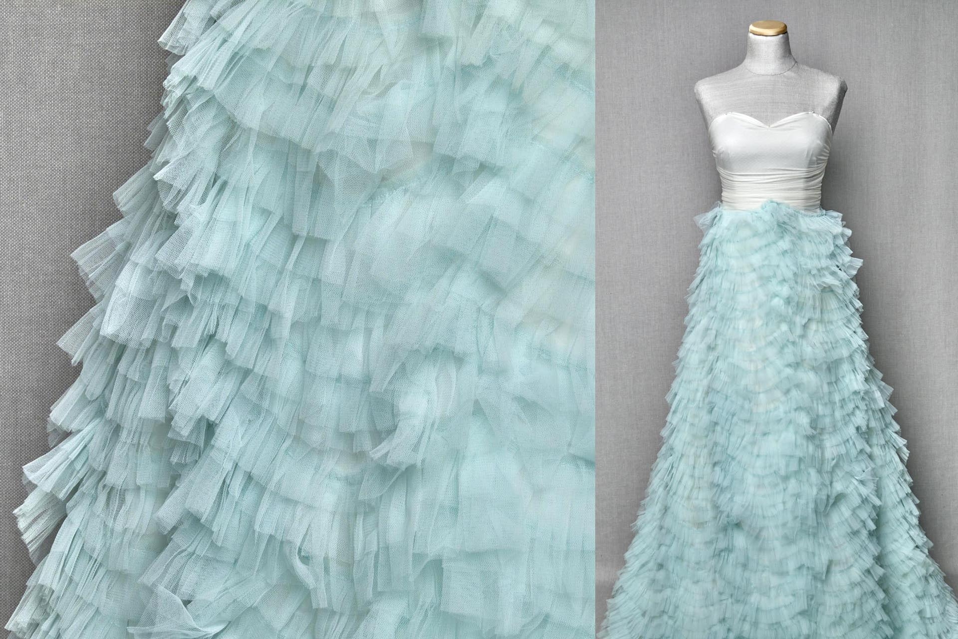This is a pretty ruffle fabric made from layers of tulle frills, in a fresh minty aqua.