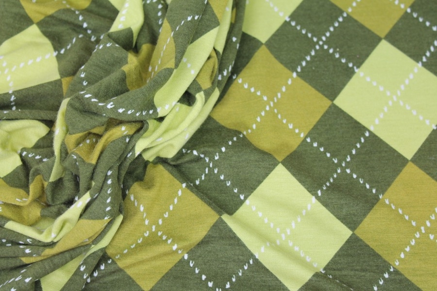 This is a soft cotton mix jersey with an argyle check print in lime, olive and dark green with white detailing, the checks are about 5.5cm wide.