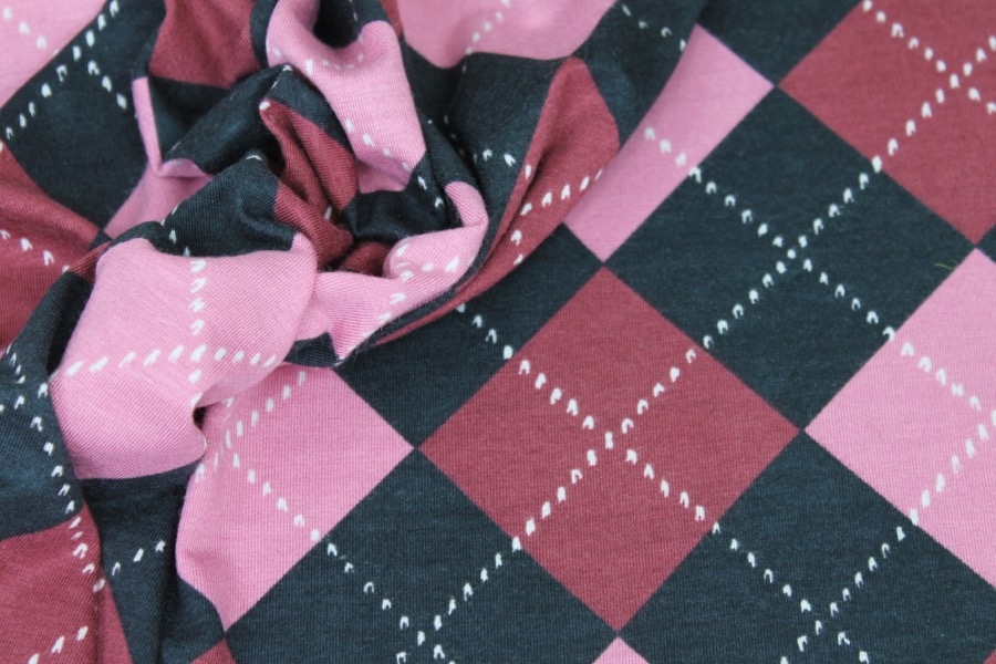 This is a soft cotton mix jersey with an argyle check print in pink burgundy and navy with white detailing, the checks are about 5.5cm wide.