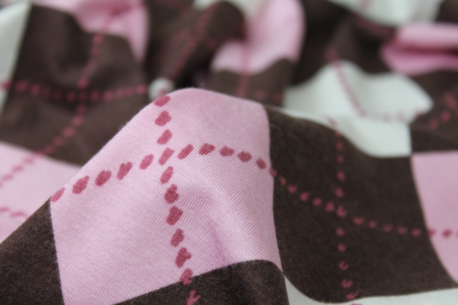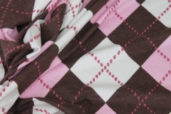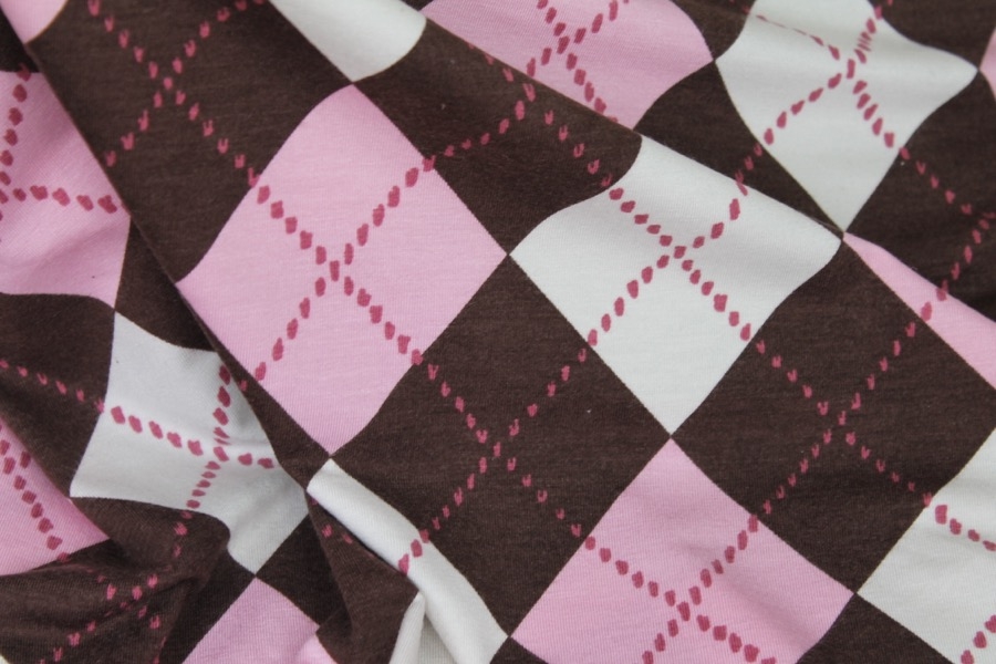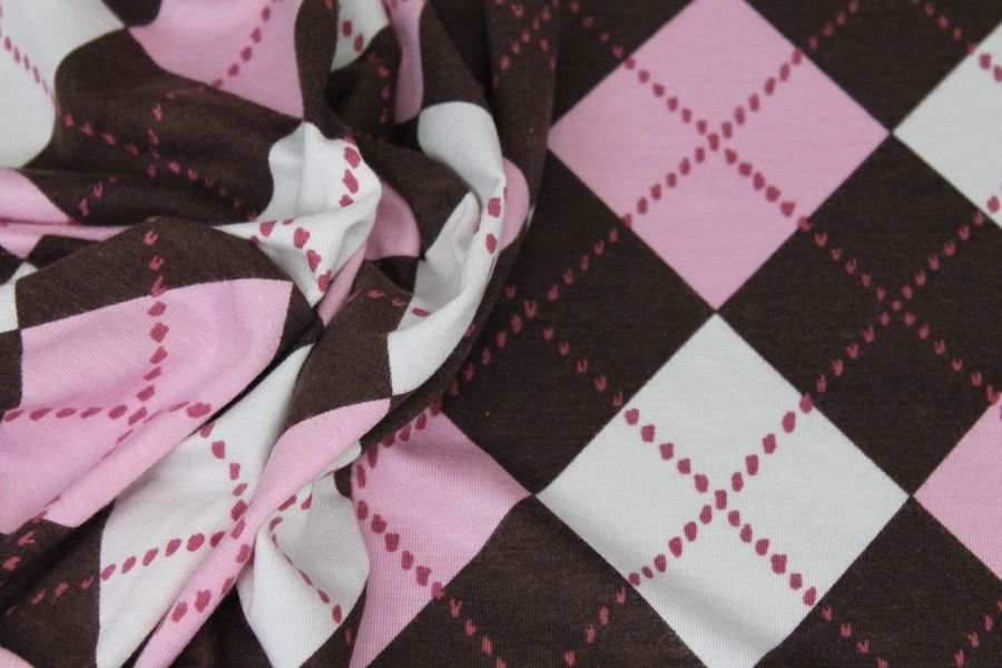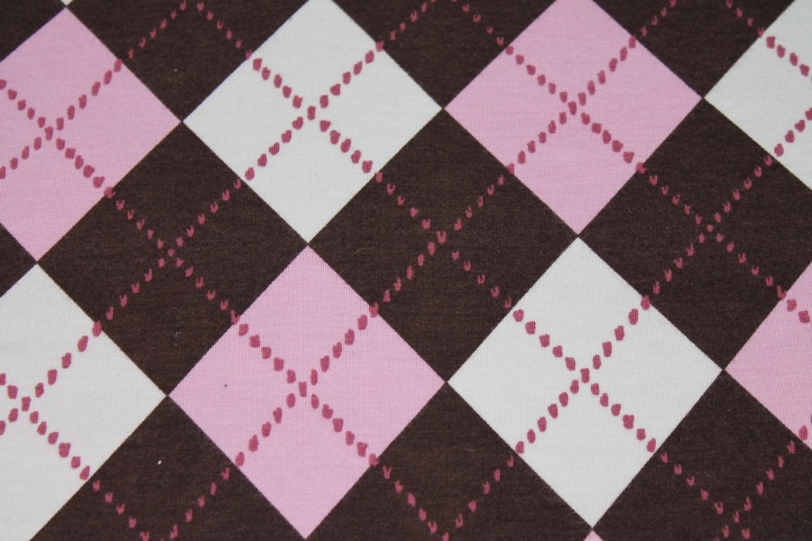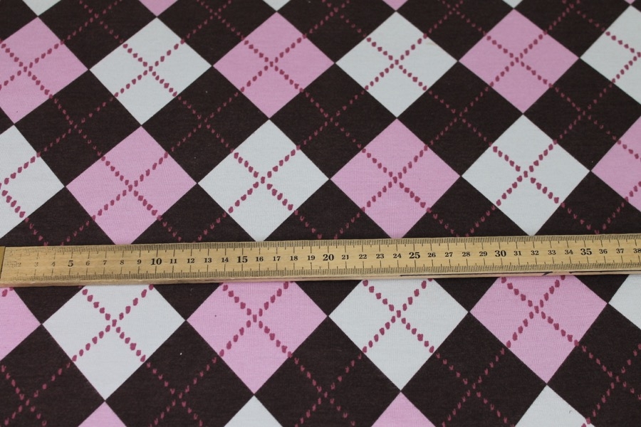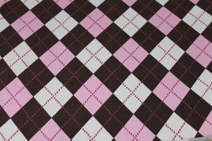 This is a soft cotton mix jersey with an argyle check print in pink ivory and brown with darker pink detailing, the checks are about 5.5cm wide.