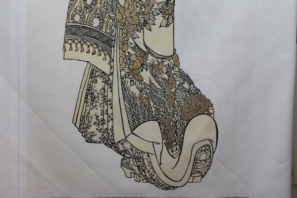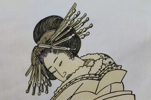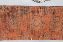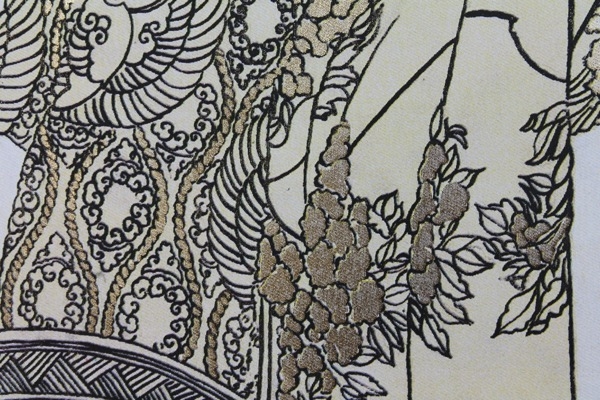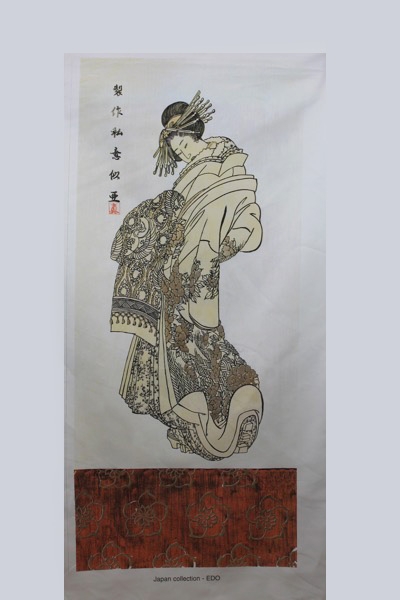 This print is of a Japanese Geisha, in black outline with details in metallic gold. It measures in 125cm height and 55cm in width and is sold individually.
