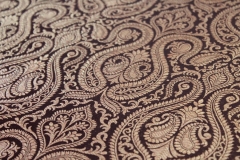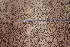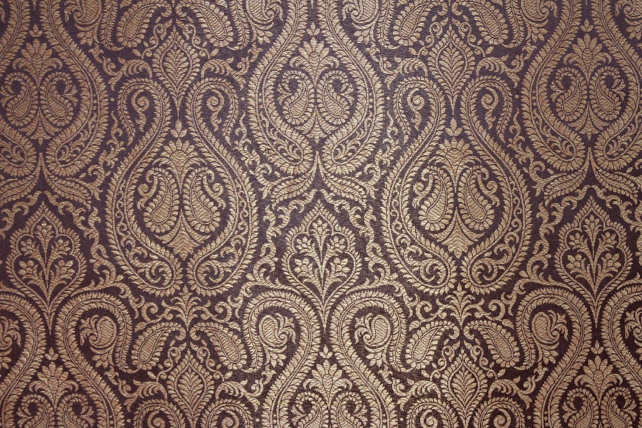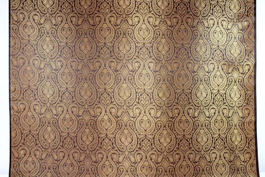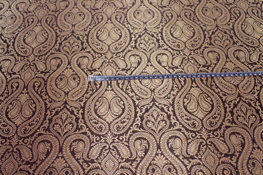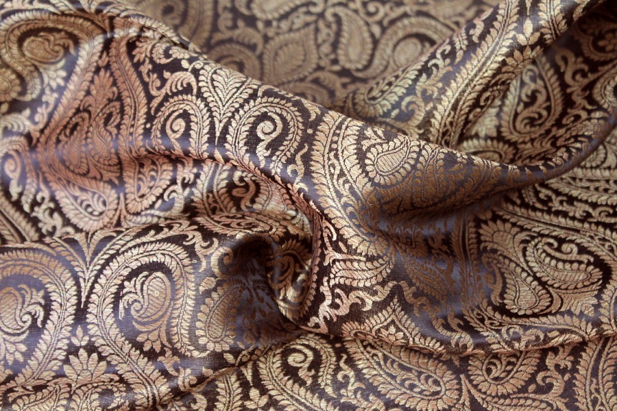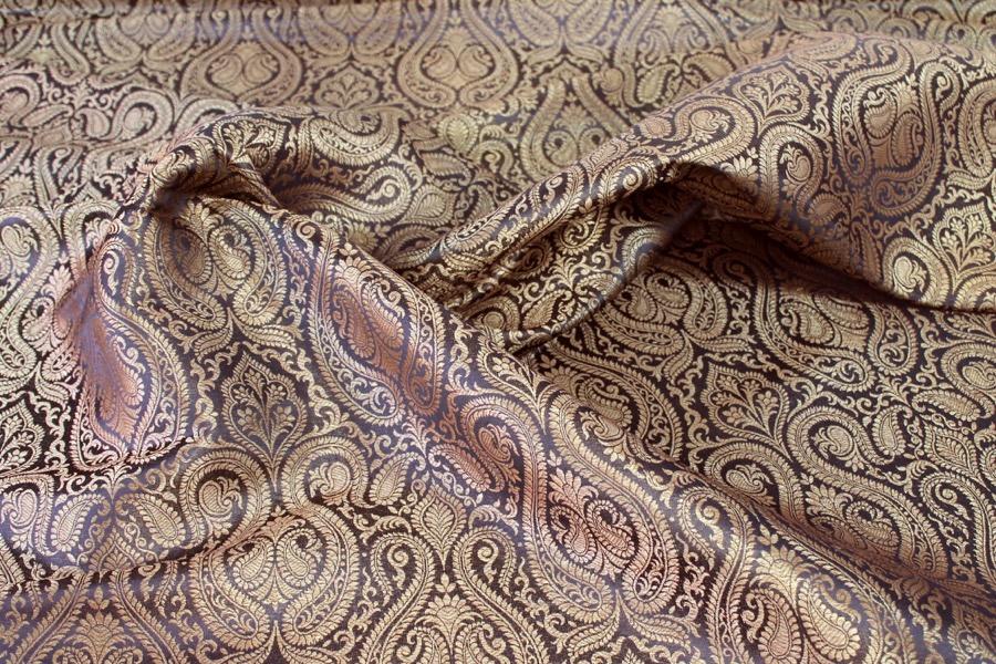Mixed fibre brocade from the Banaras region of India. Features a classic paisley type design in black and warm gold metallic thread.