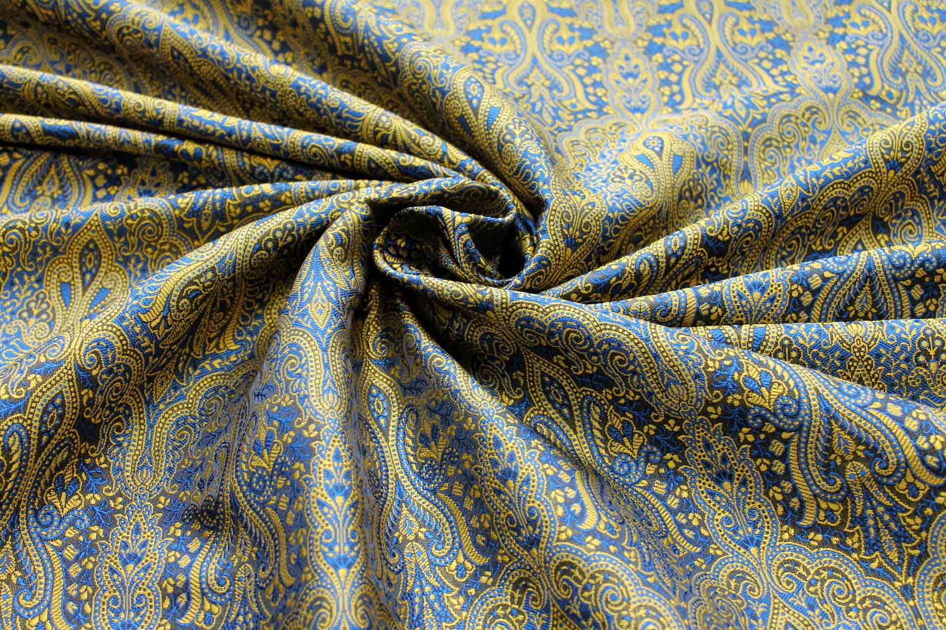 100% polyester brocade, from the Banaras region of India. Features a classic floral/paisley type design in blue and yellow on a black base, no metallic thread.