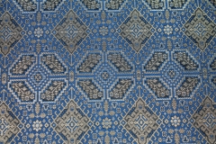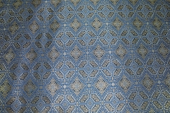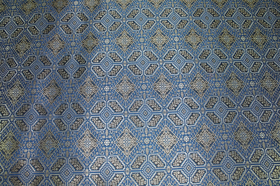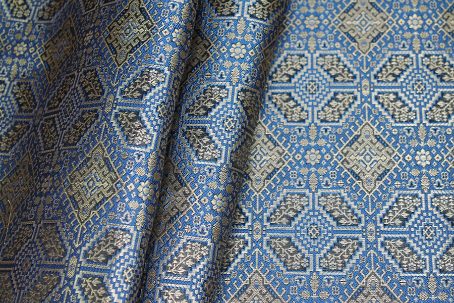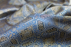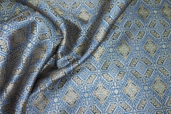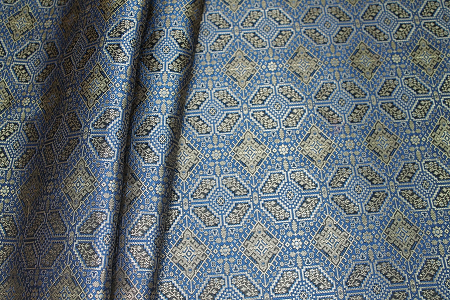 100% polyester brocade, from the Banaras region of India. Features a geometric type design in blue, metallic gold and black.