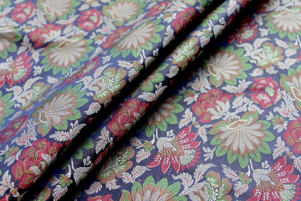100% polyester brocade, from the Banaras region of India. Features a floral design in dark blue, royal blue and green.