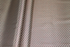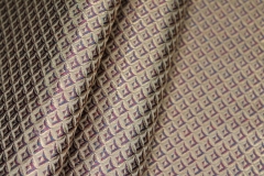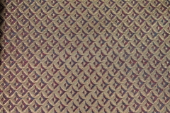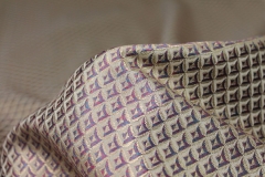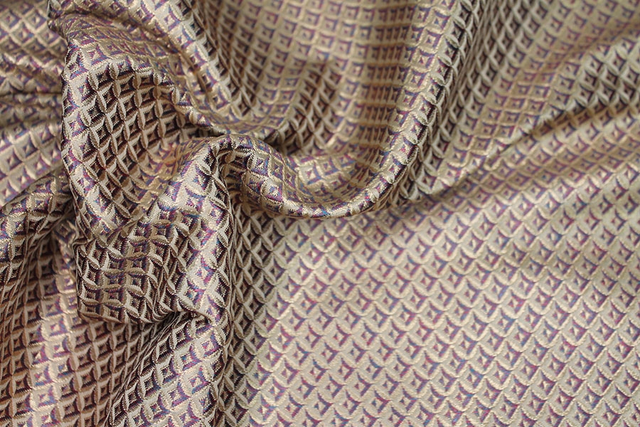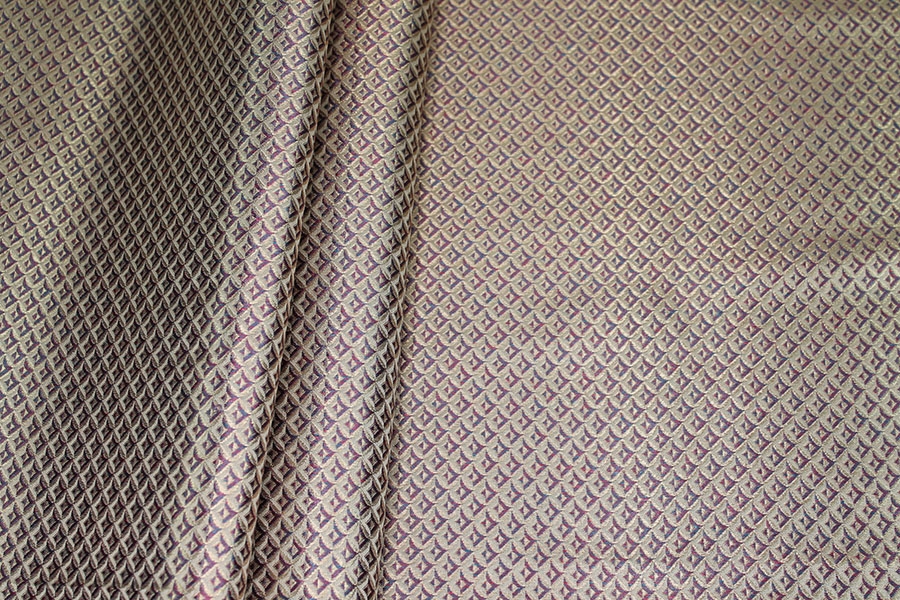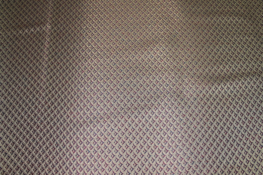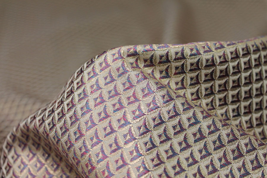 Silk brocade with metallic thread, from the Banaras region of India. Features a small geometric design in pink, blue and straw gold with gold metallic detailing. 96% silk 4% metal.