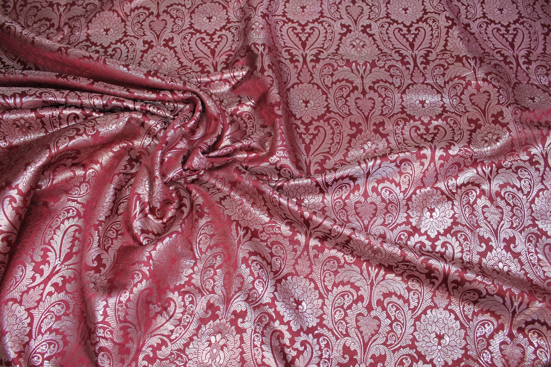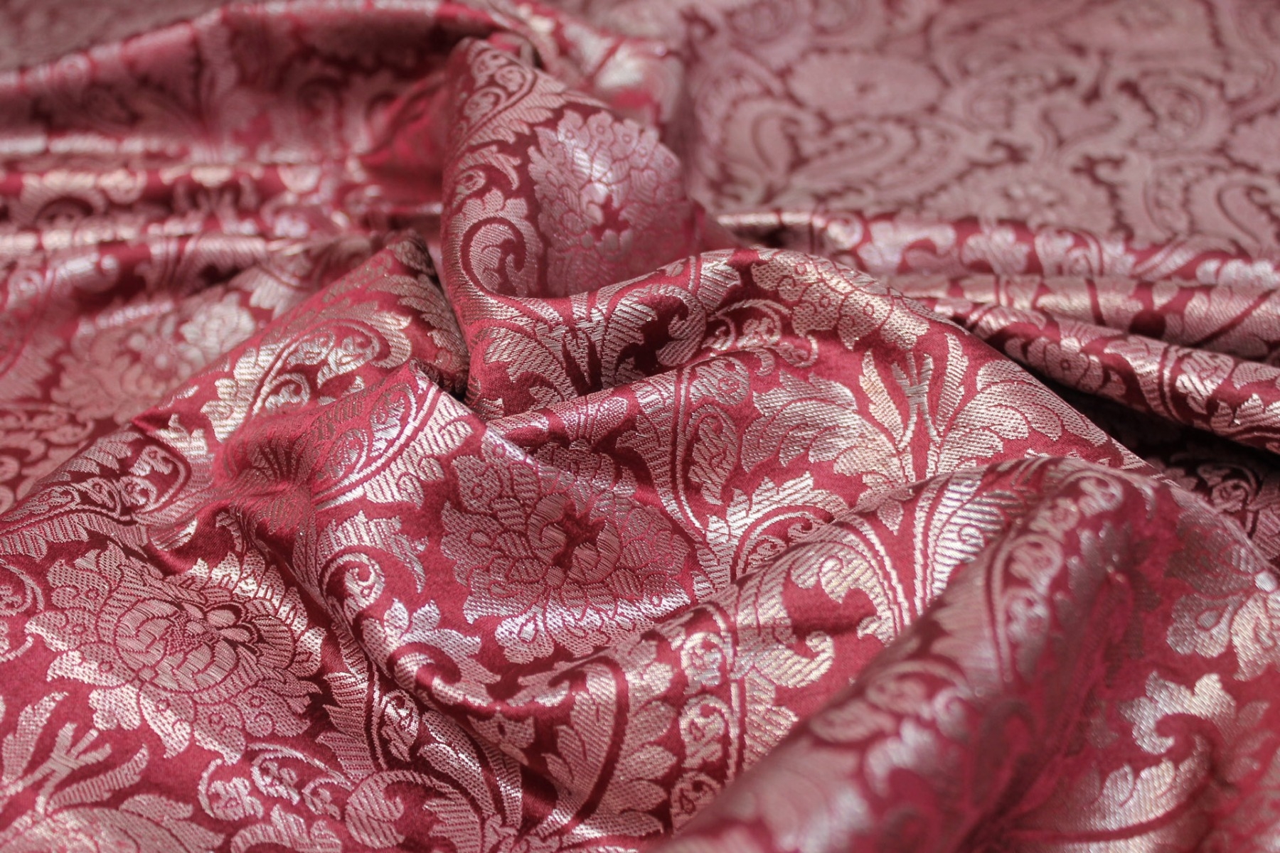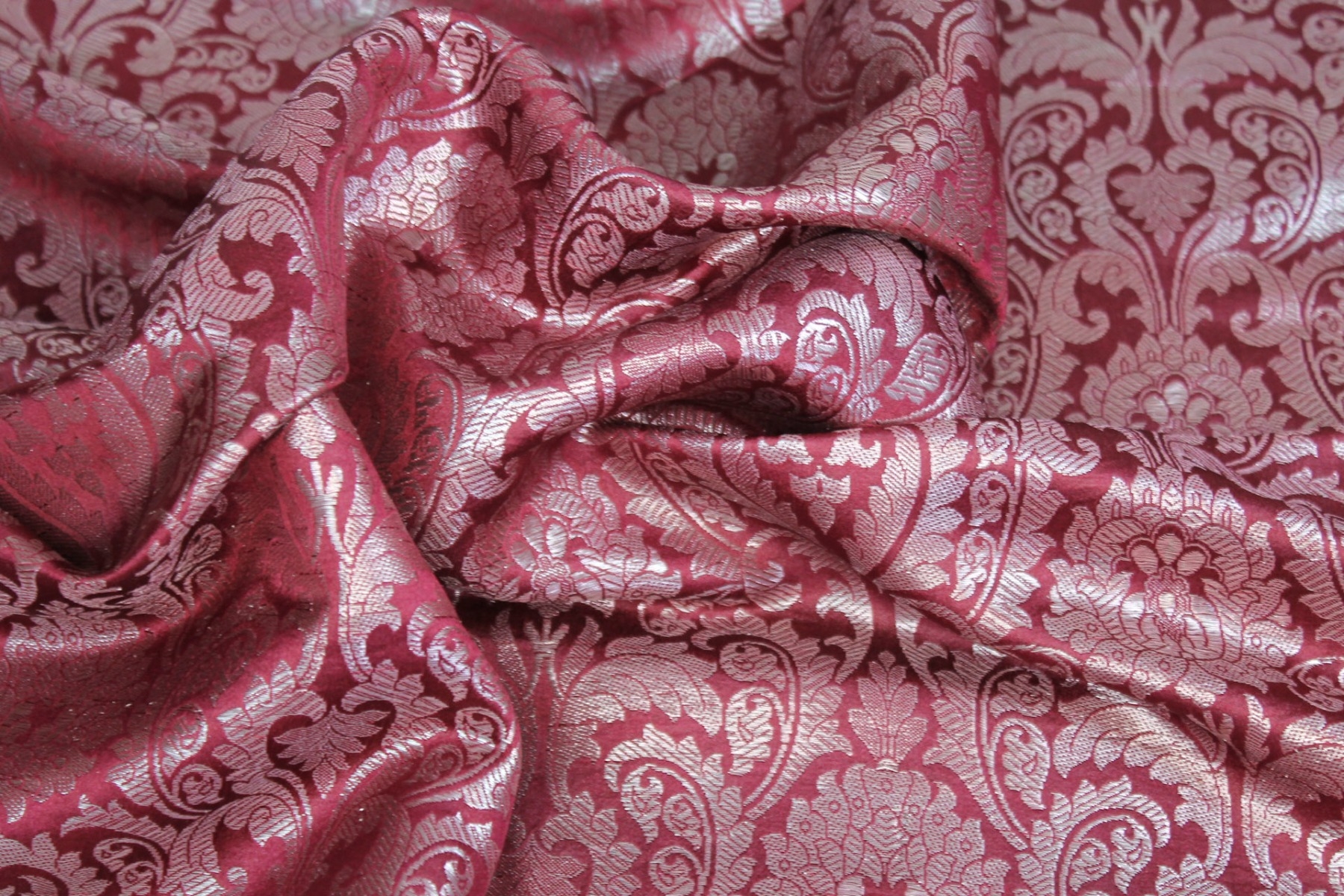 100% silk brocade with metallic thread, from the Banaras region of India. Features a paisley/floral design in deep red with warm silver details.