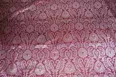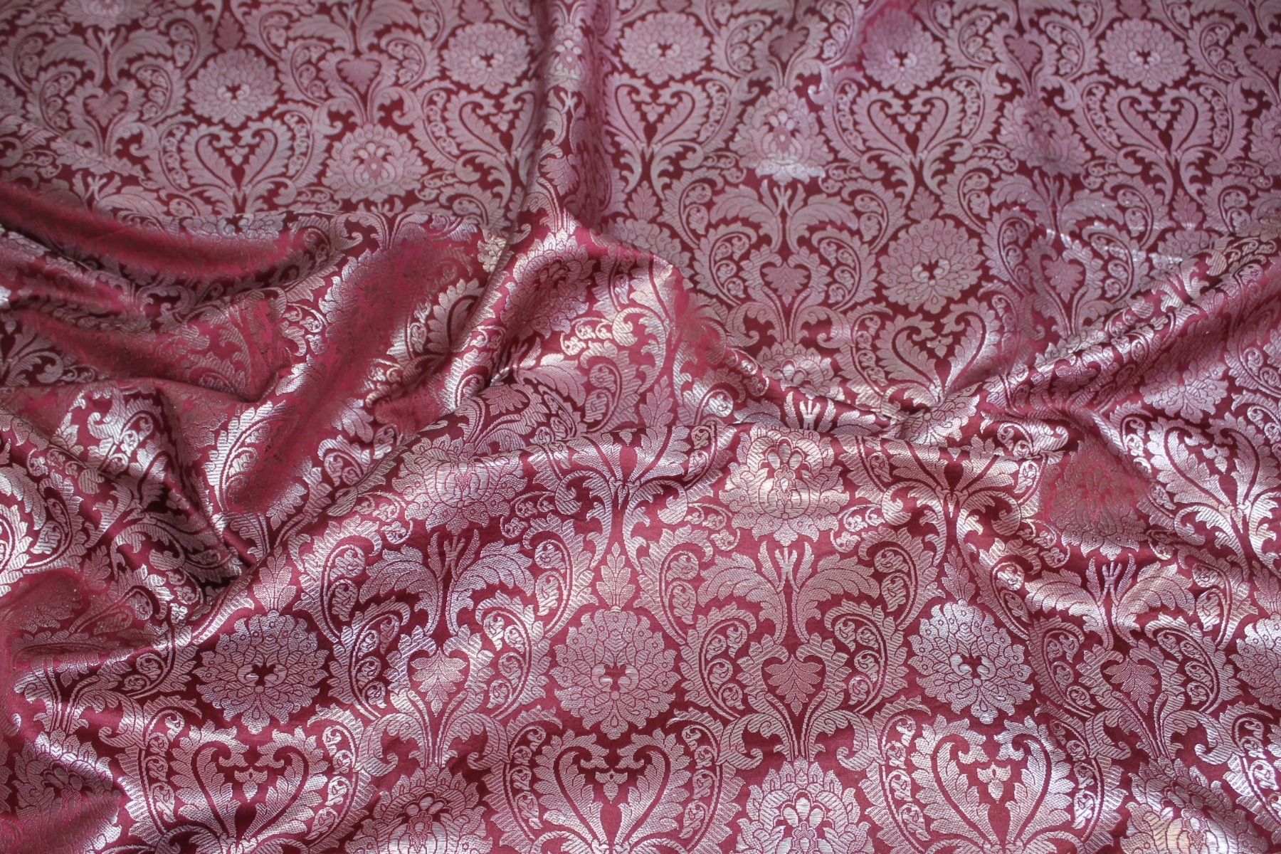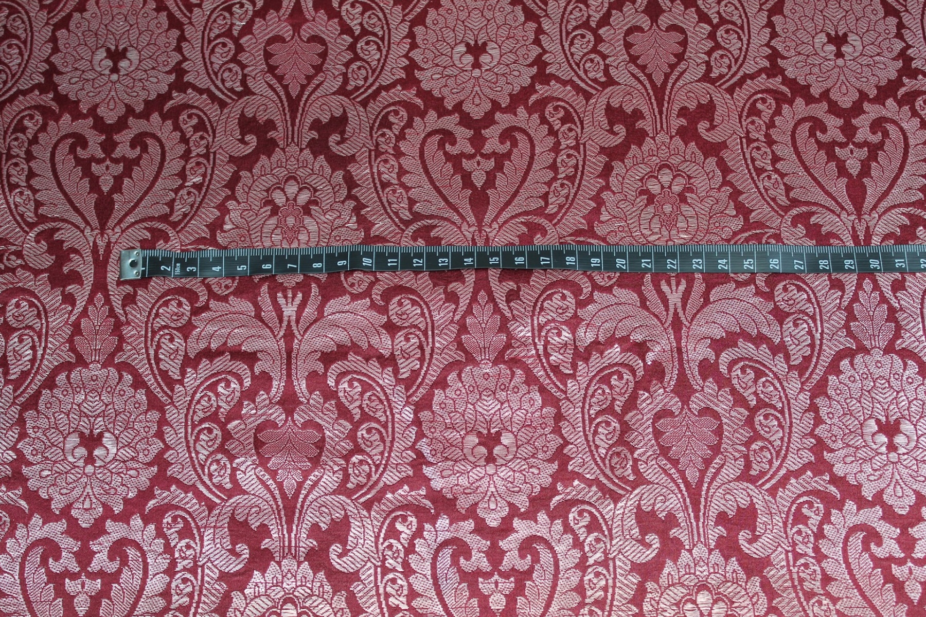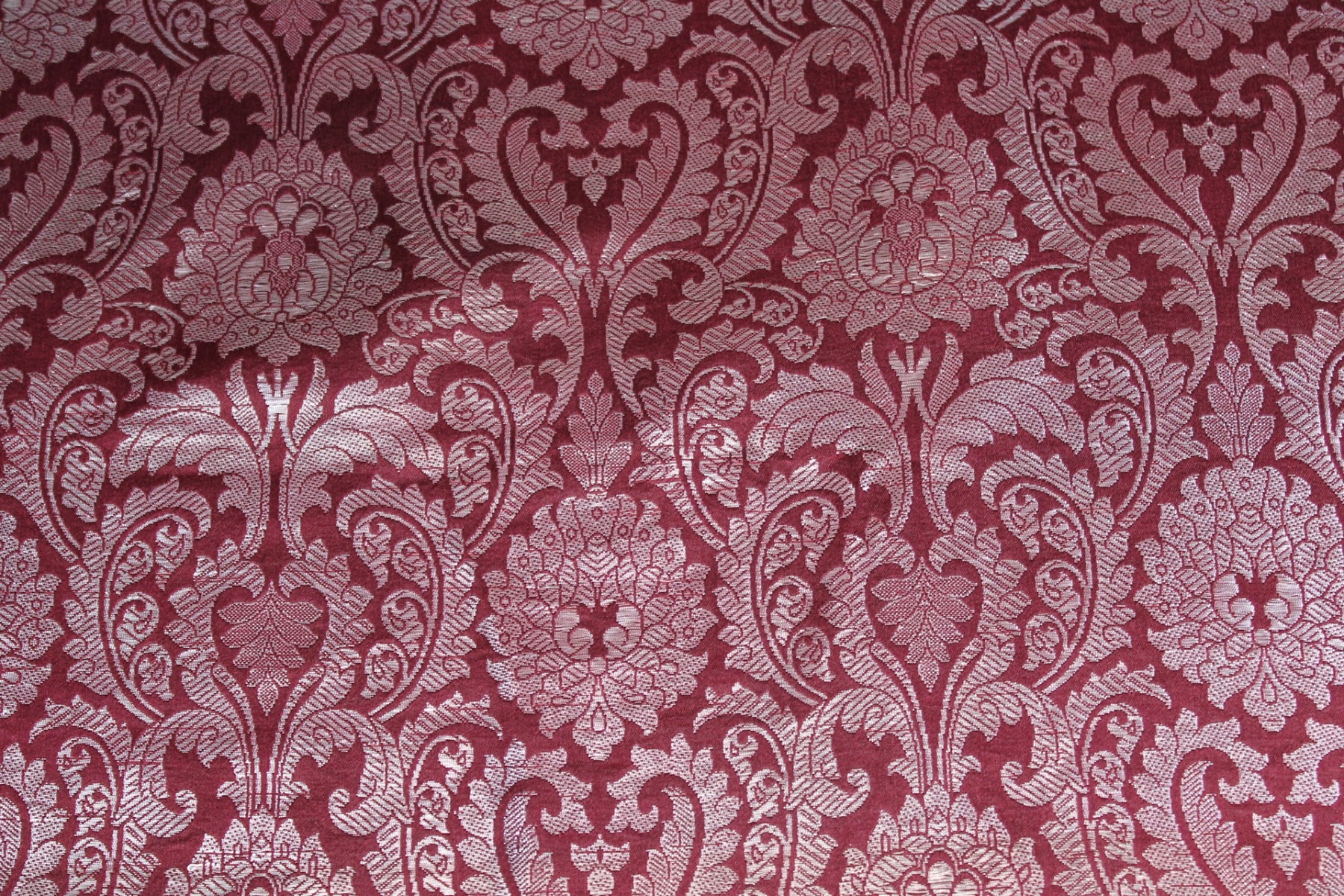 100% silk brocade with metallic thread, from the Banaras region of India. Features a paisley/floral design in deep red with warm silver details.