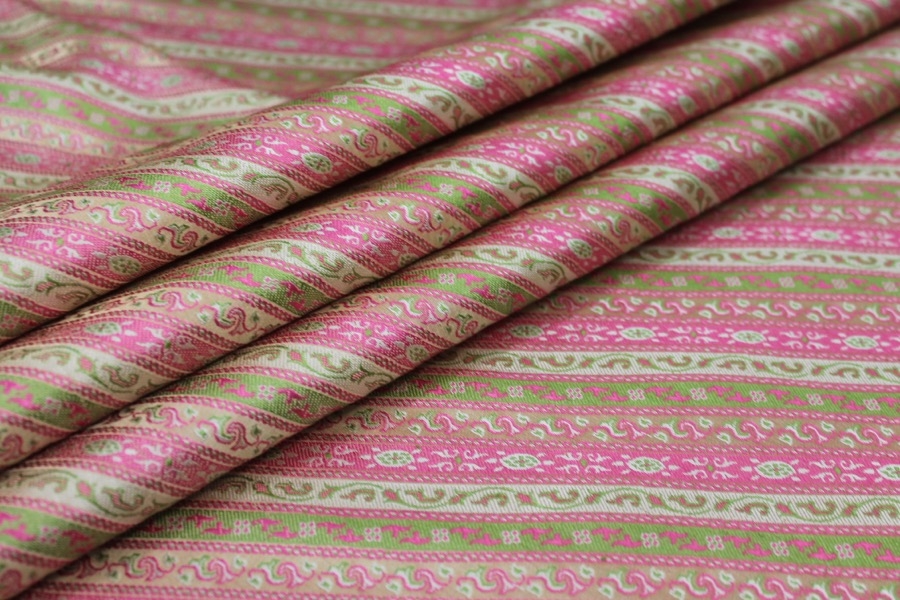 100% polyester brocade, from the Banaras region of India. Features a diagonal stripe design in pink, green and sand, no metallic thread.