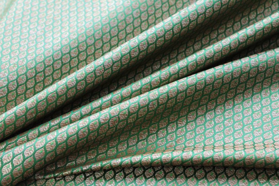 100% viscose brocade, from the Banaras region of India. Features a small leaf type design, green on green. The leaves are approx 1cm long.