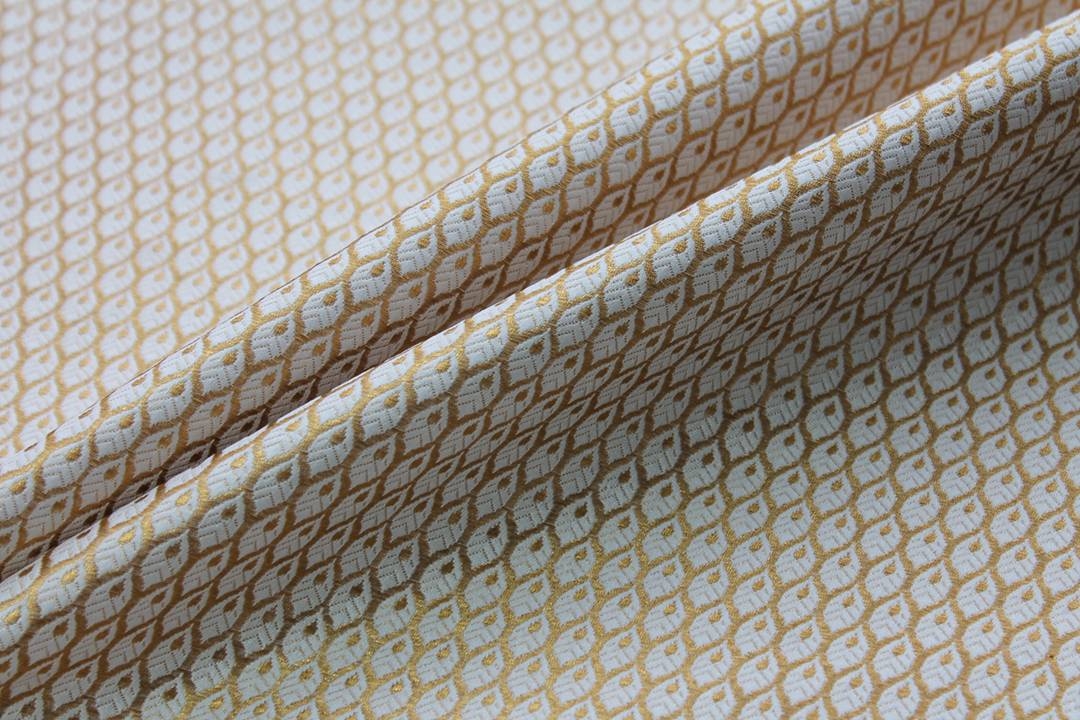 90% silk brocade, from the Banaras region of India. Features a small leaf type design, gold metallic thread on ivory. The leaves are approx 1cm long. 10% metallic thread.