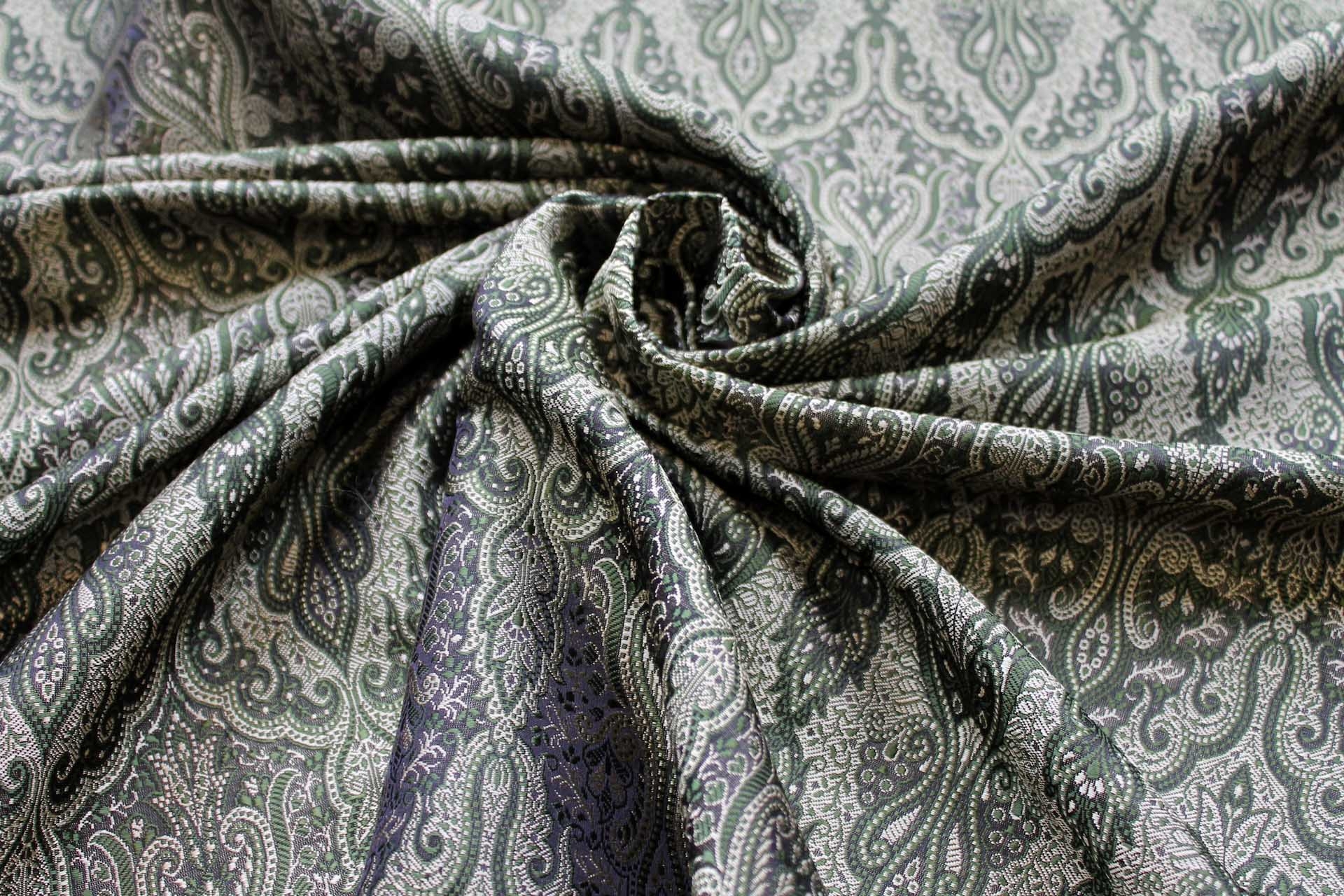 100% polyester brocade, from the Banaras region of India. Features a classic floral/paisley type design in pale gold and green on a black base, no metallic thread.