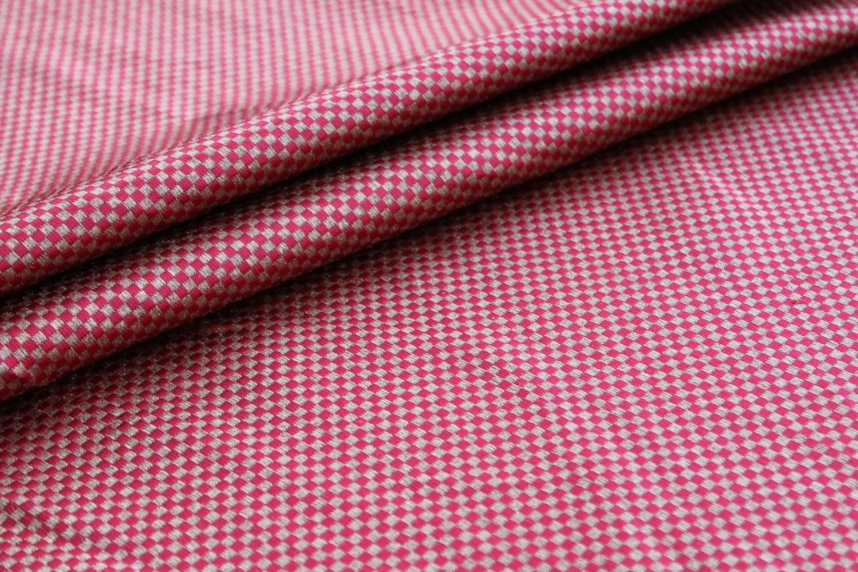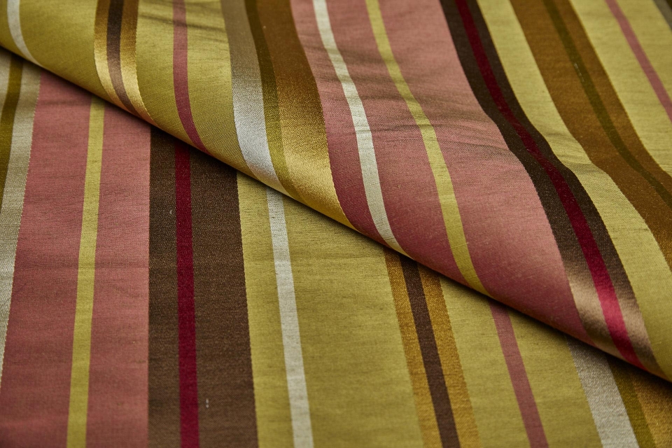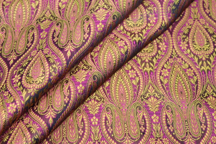 100% polyester brocade, from the Banaras region of India. Features a classic floral/paisley type design in amber and pink on a dark base.
