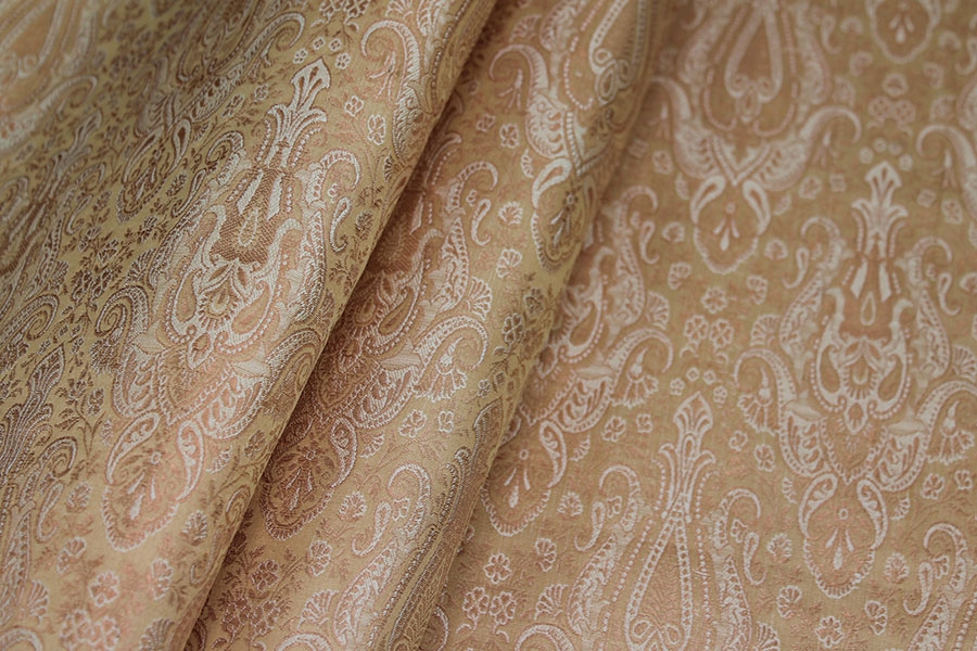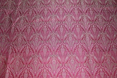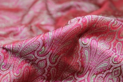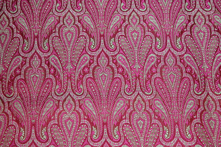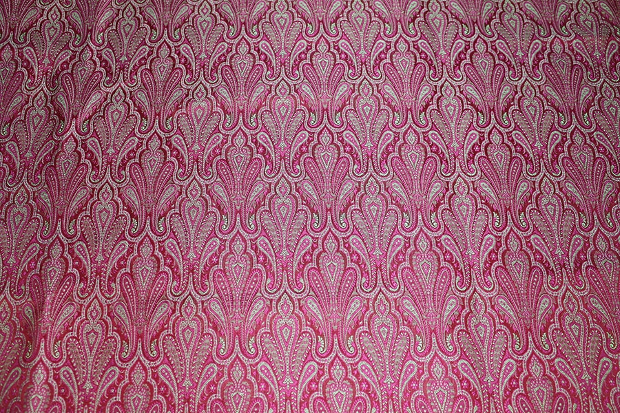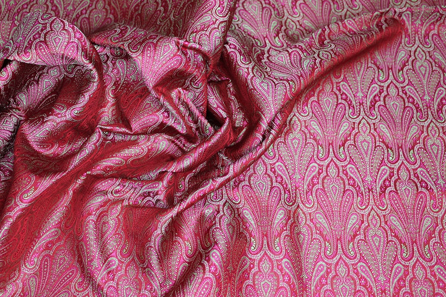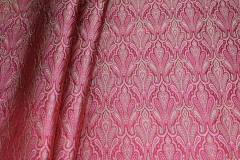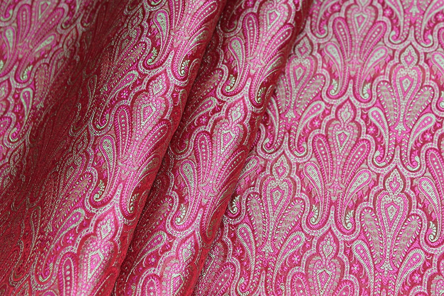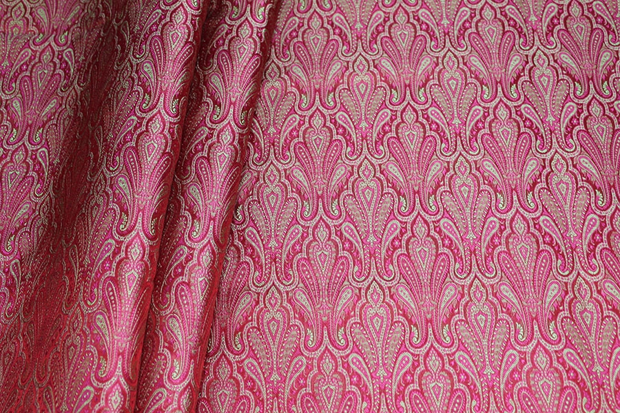 100% polyester brocade, from the Banaras region of India. Features a classic floral/paisley type design in dark red, pink and sage green, with no metallic thread.