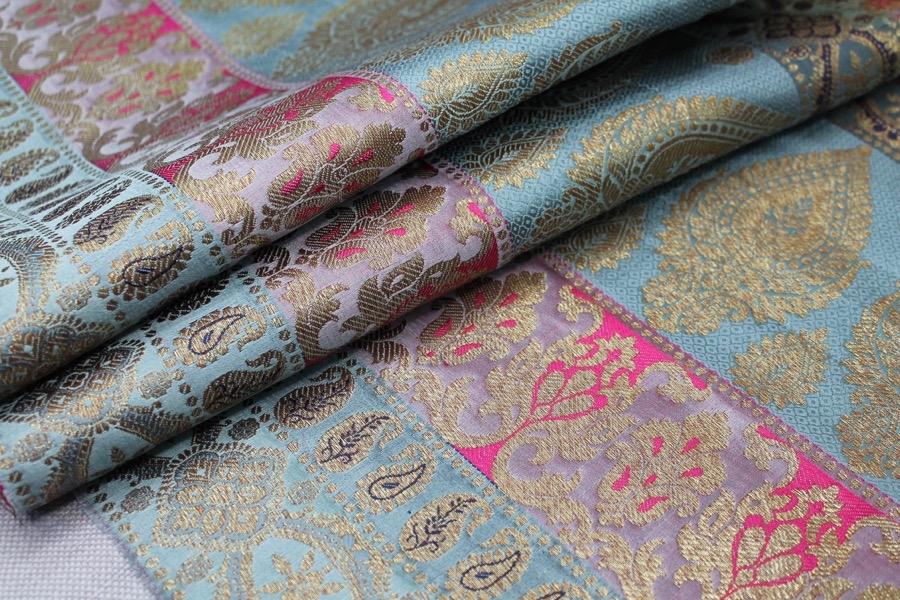 100% polyester brocade, from the Banaras region of India. Features classic Indian patterns in stripes in dusty blues, pinks and navy blue, with gold metallic thread.