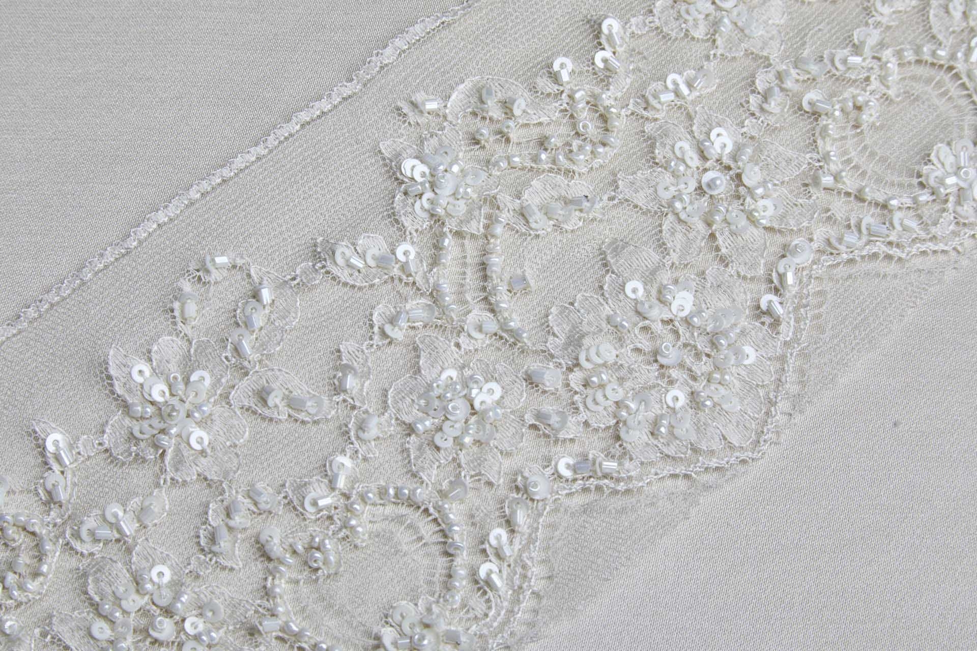 A wider beaded, sequinned and embroidered silk tulle trim in ivory, hand beaded with ivory sequins and bugle and seed beads. This trim measures aqpprox 12cm, and it has a single scallop.