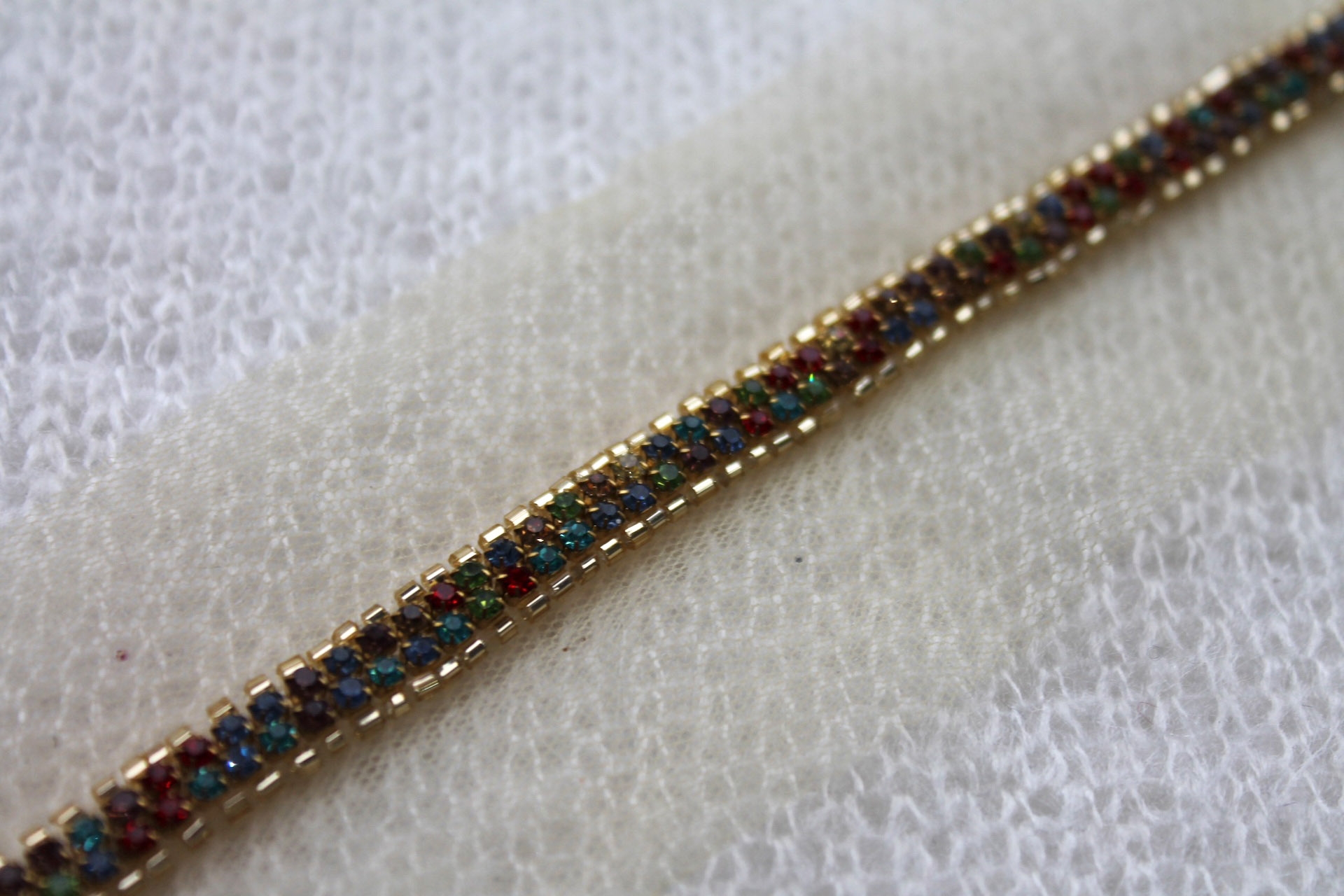 A beautiful diamanté trim which has been hand beaded with gold glass beads and high quality cut glass set crystals in many colours on a cream tulle base. Approx 0.8 cm wide, a very decorative trim.