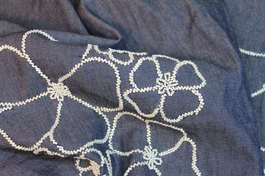 This is a European quality denim in medium to dark blue, with large scale beaded flowers in white glass bugle beads. The flowers are about 25cm apart and about 30cm across. Perfect for jackets, jeans shorts and overalls or even dresses and skirts. The denim is 140cm wide.