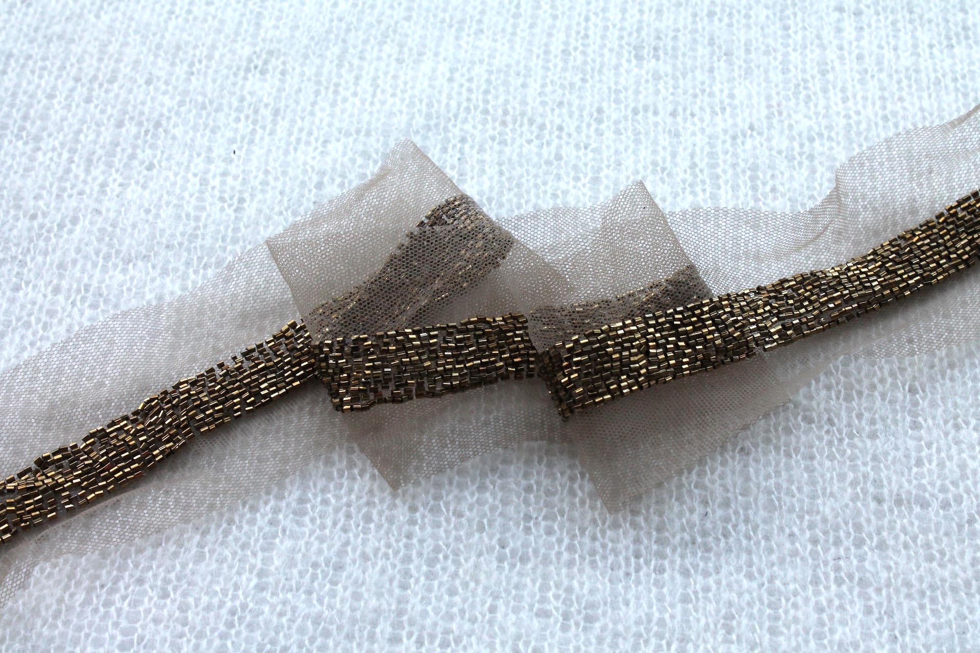 This is a super fine beaded trim, made with micro beads in antique gold glass sewn onto a tulle base.