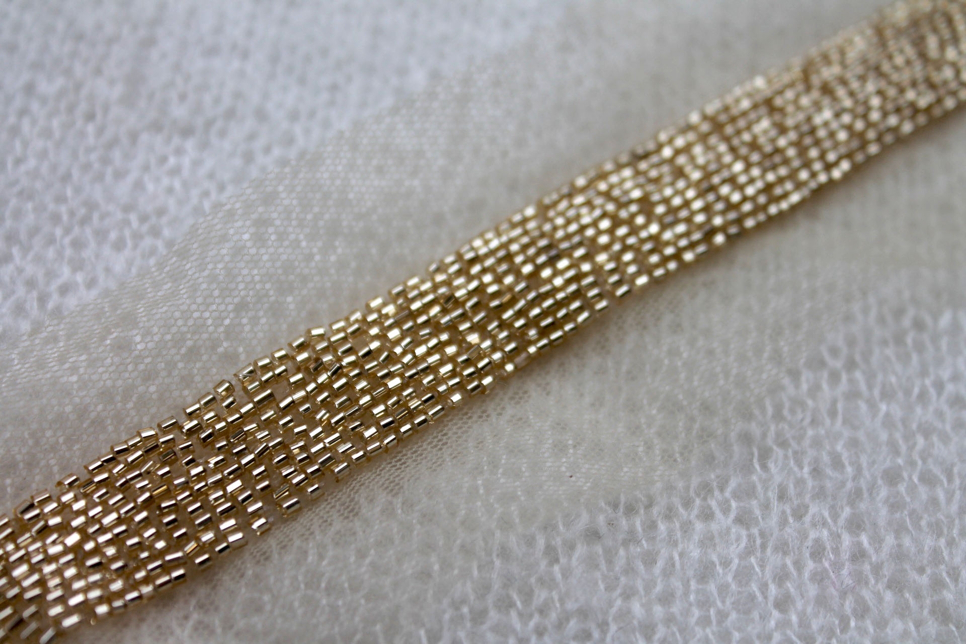 This is a super fine beaded trim, made with japanese micro beads in gold glass sewn onto a tulle base.