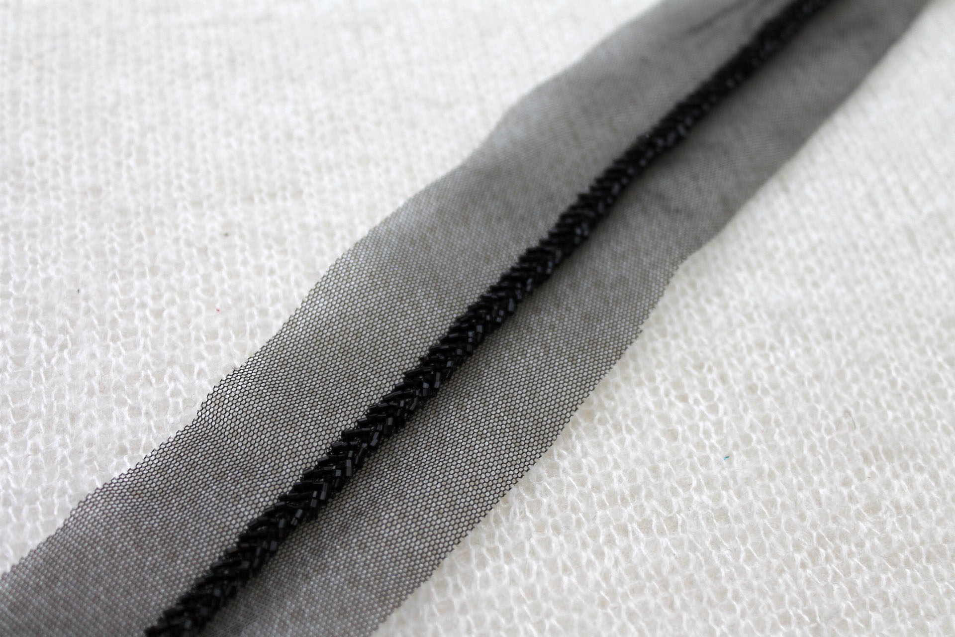 This is a super fine beaded trim, made with japanese micro beads in black glass sewn onto a tulle base in a herringbone pattern.