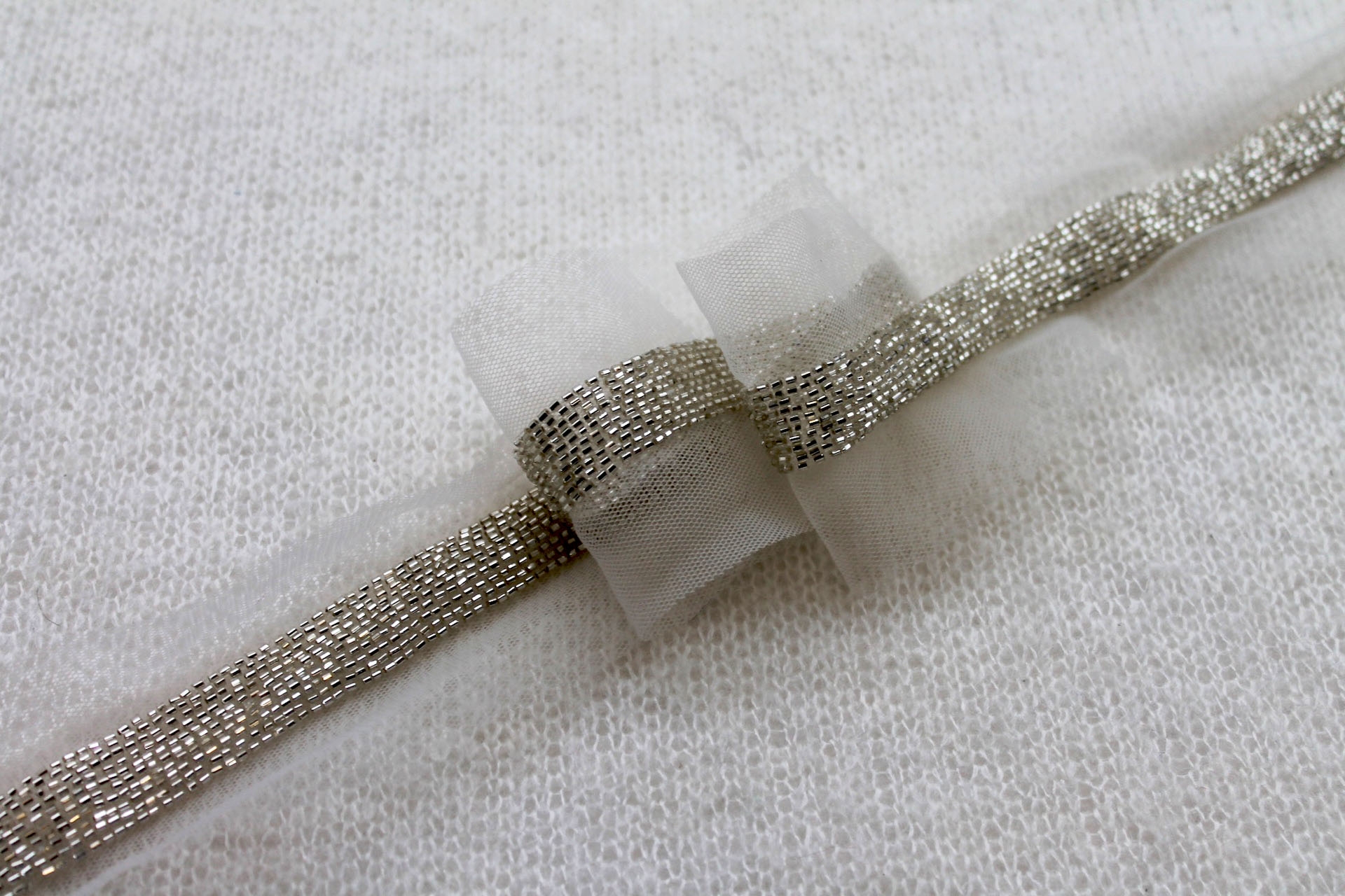 This is a super fine beaded trim, made with Japanese micro beads in silver lined clear glass sewn onto a tulle base.
