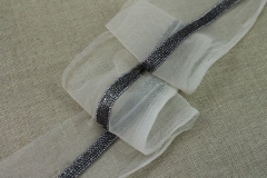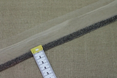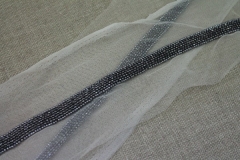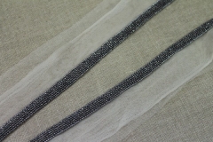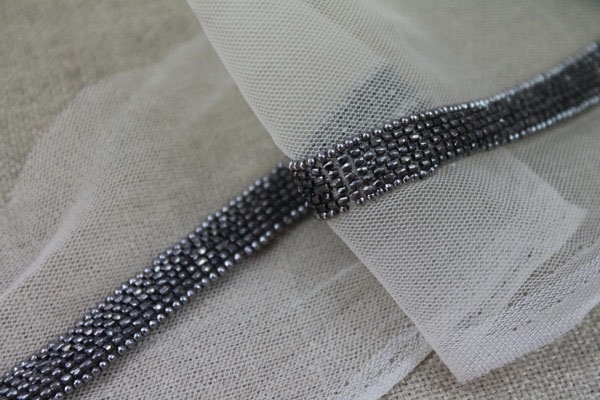 This is a fine beaded trim, made with gunmetal glass beads sewn onto a tulle base in a linear pattern.