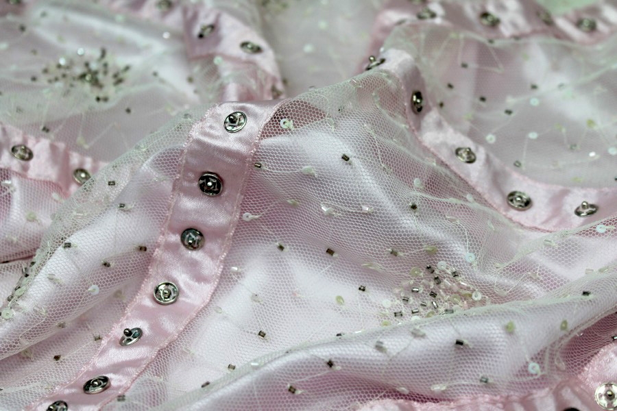 This is a fun beaded fabric made from an ivory nylon tulle that has been beaded in small starburst patterns, with criss crossing pink satin ribbons decorated with press studs.