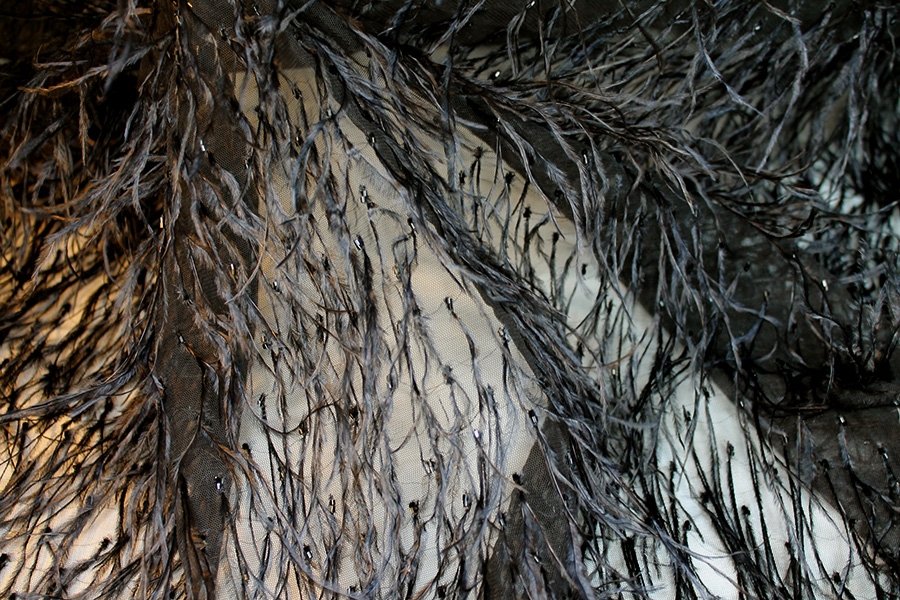 A black nylon tulle with gorgeous black ostrich feather strands and glass beads, providing a delightful and fun fabric.