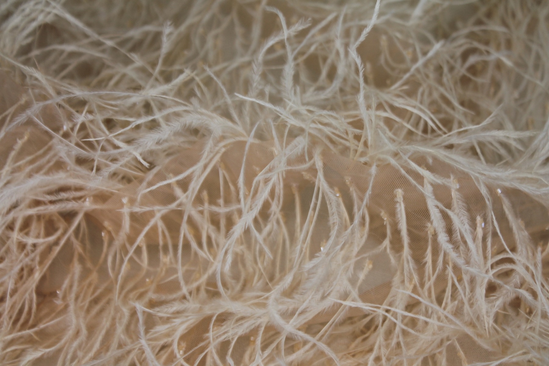 A nude nylon tulle with gorgeous pale nude ostrich feather strands and glass beads, providing a delightful and fun fabric.