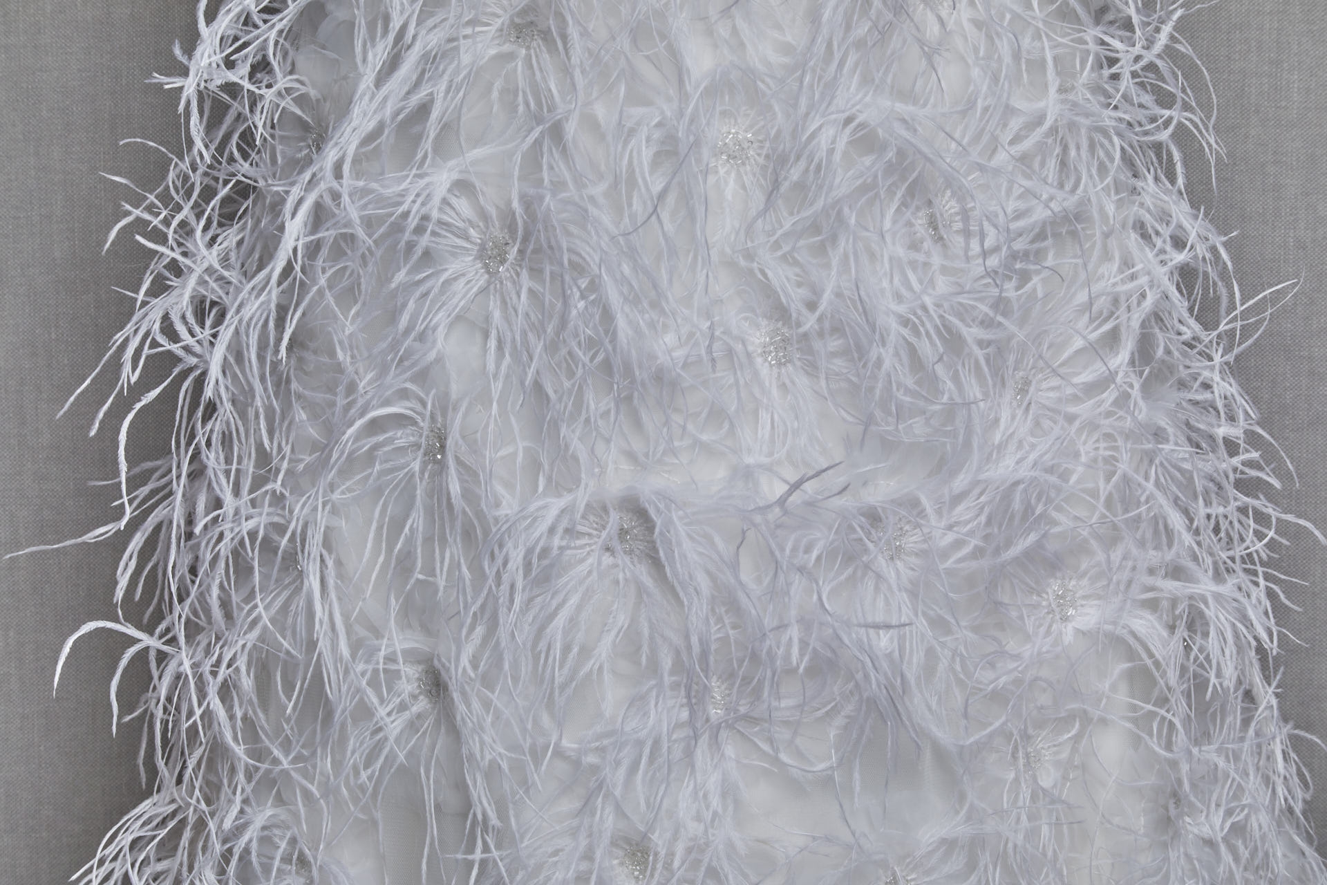 An off-white nylon tulle with gorgeous white ostrich feathers and clear glass beads, providing a delightful and fun fabric.