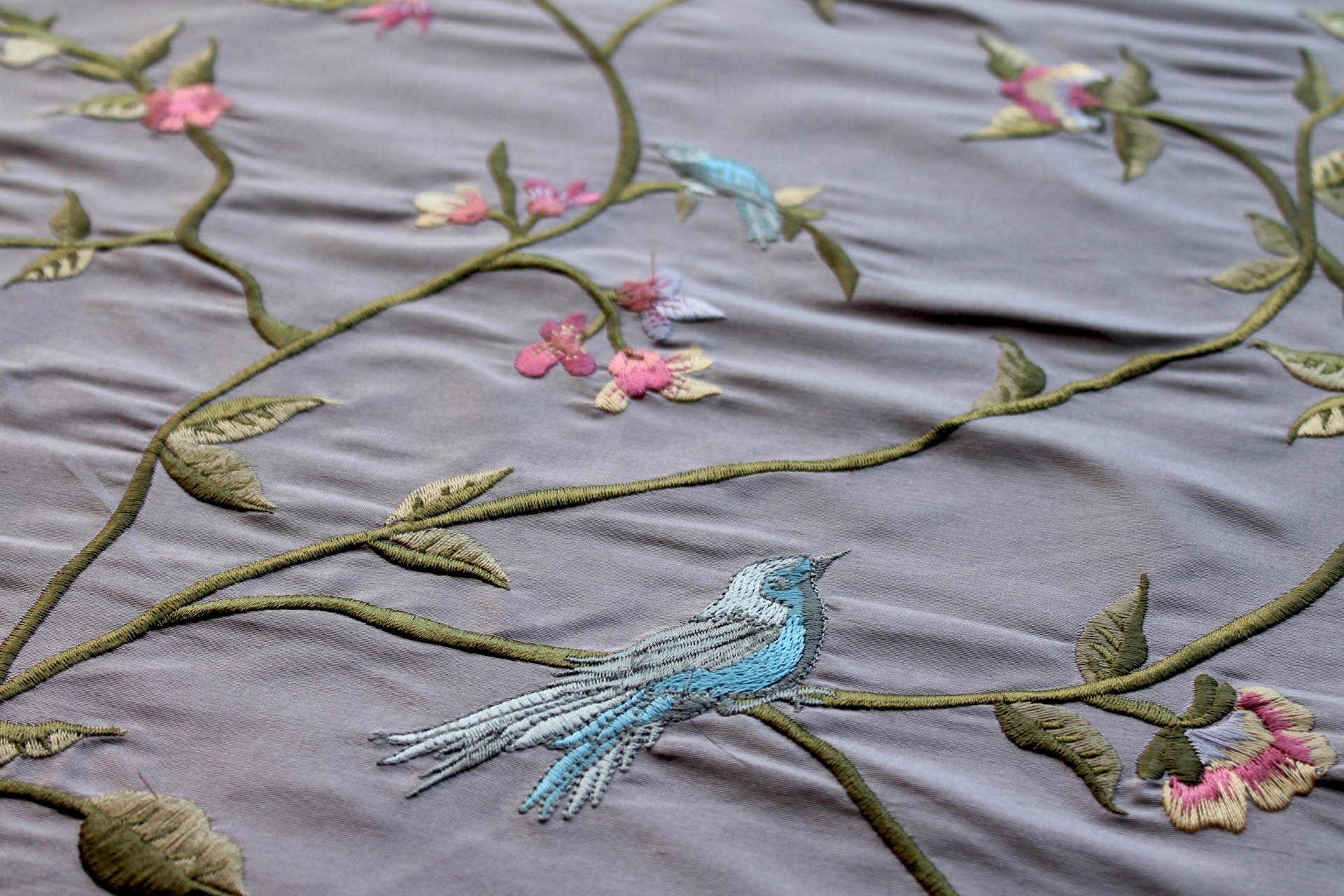 Our classic 100% silk dupion base in lilac (B36 is that colour of the plain to match) with a stunning William Morris inspired embroidered pattern of birds amongst flowers, leaves and vines, in blue, green and pink.