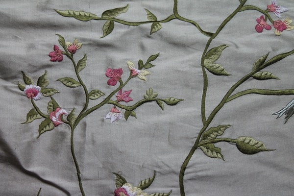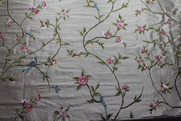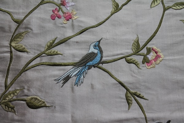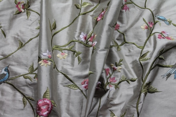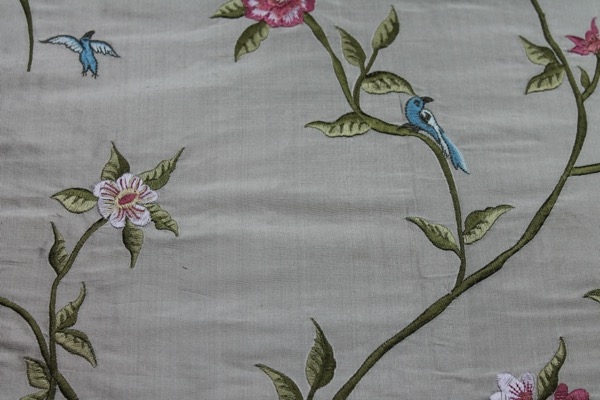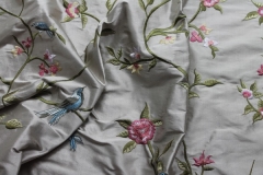 Our classic 100% silk dupion base in an oyster colour with a stunning William Morris inspired embroidery of birds amongst flowers, leaves and vines, in blue, green and pink.