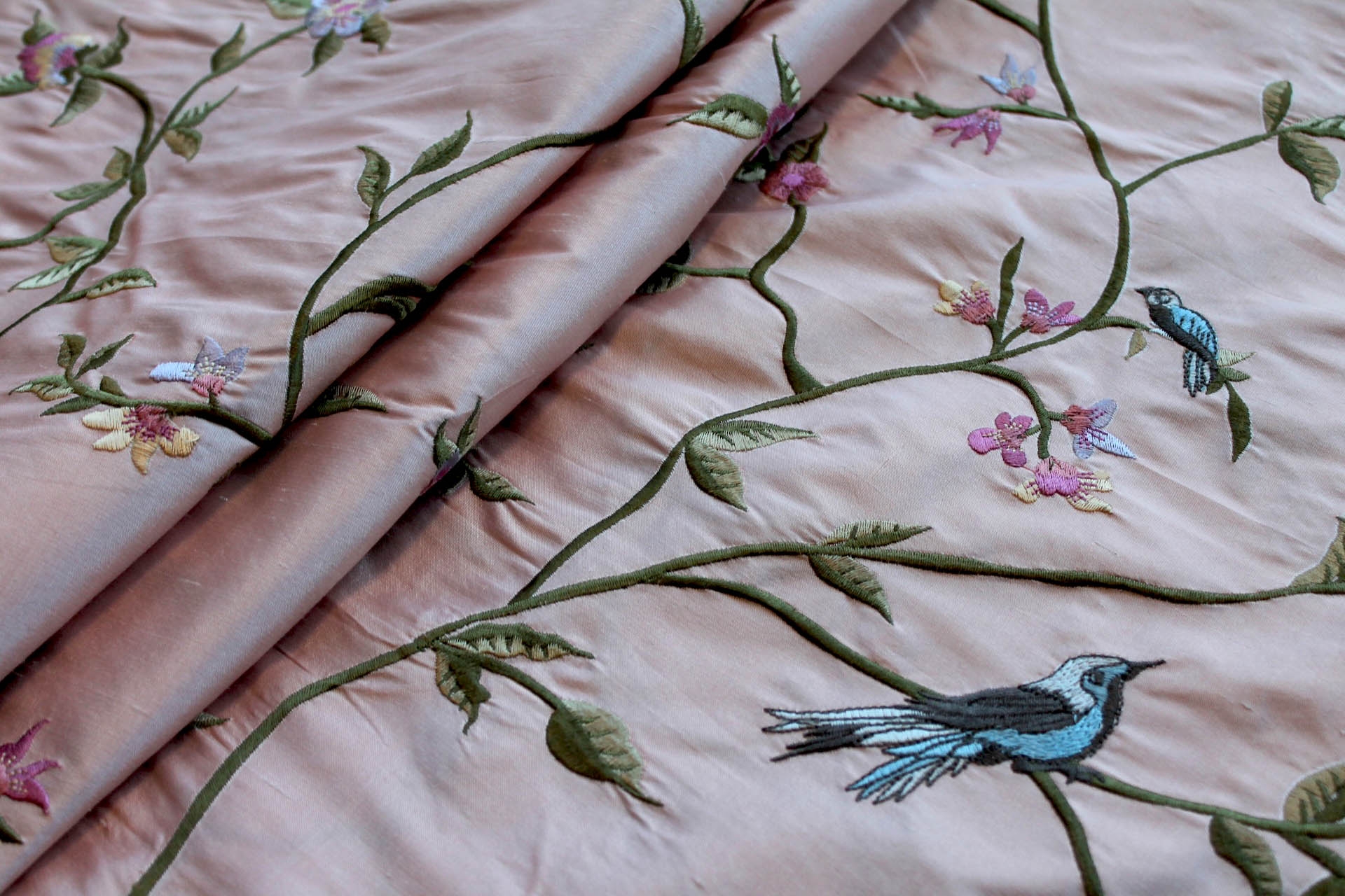 Our classic 100% silk dupion base in pink (B39 is that colour of the plain to match) with a stunning William Morris inspired embroidered pattern of birds amongst flowers, leaves and vines, in blue, green and pink.