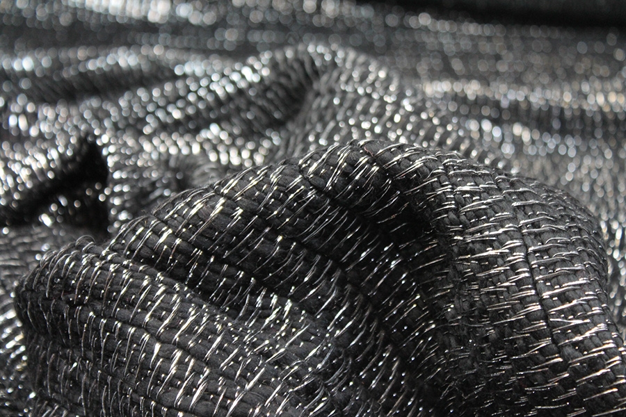 This is a textured loose weave fabric, made from chunky acrylic yarn in black on a silver lurex warp.