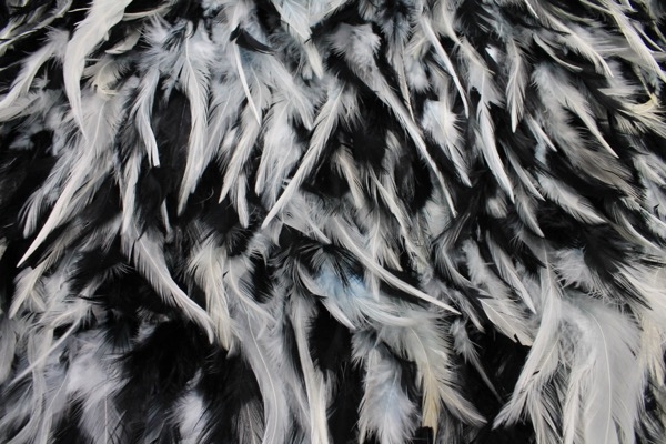 A black silk chiffon which has been completely covered in gorgeous black and white feathers, providing a delightful and fun fabric. This fabric is hand embellished, these are real feathers and the appearance of the fabric is completely unique. It can be used for whole garments or as an embellishment.