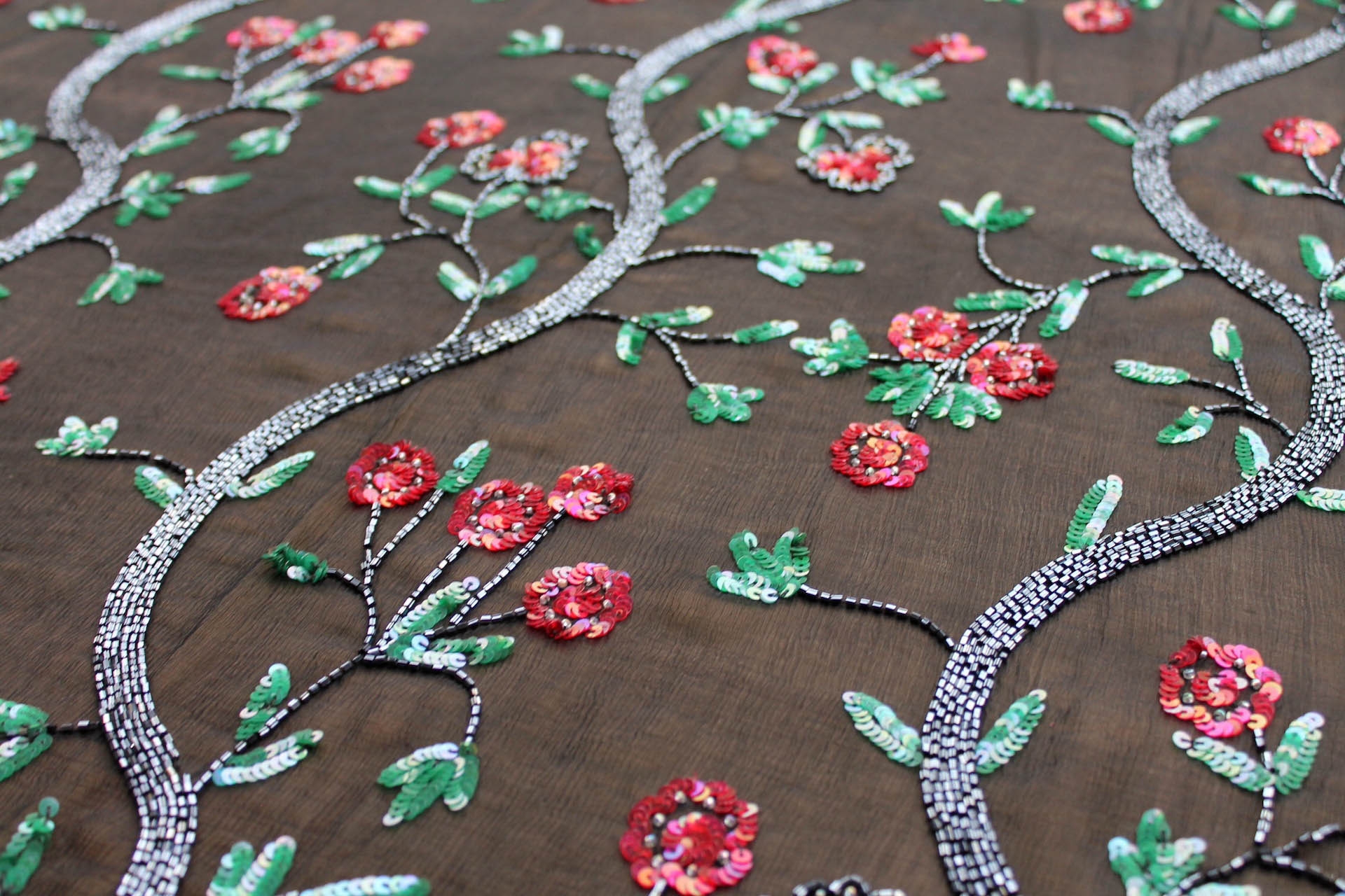 Black Silk Organza - Red and Green Applique FlowersSpecial Price £35.00 Regular Price £65.00 -