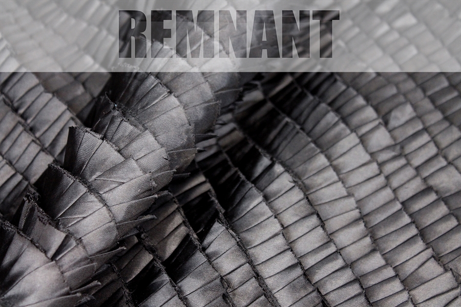 This is a remnant piece of a frivolous and fun textured fabric, made up of strips cut from black satin, sewn in frills diagonally across a base fabric.